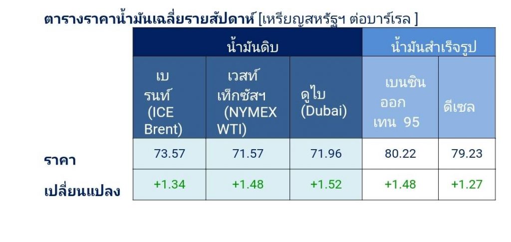 ทีมวิเคราะห์ตลาดต่างประเทศ หน่วยธุรกิจการค้าระหว่างประเทศ บริษัท ปตท. จำกัด (มหาชน) วิเคราะห์แนวโน้มราคาน้ำมันดิบว่ามีแนวโน้มเป็นขาขึ้น ตามมุมมองเชิงบวกต่อการใช้พลังงานที่ฟื้นตัวตามสภาวะเศรษฐกิจ สำนักตัวแทนพลังงานระหว่างประเทศ (IEA) คาดการณ์อุปสงค์น้ำมันโลกในปี 2564 จะเพิ่มขึ้นจากปีก่อน 5.36 ล้านบาร์เรลต่อวัน อยู่ที่ 96.39 ล้านบาร์เรลต่อวัน และในปี 2565 จะเพิ่มขึ้นจากปีนี้ 3.07 ล้านบาร์เรลต่อวัน อยู่ที่ 99.46 ล้านบาร์เรลต่อวัน
