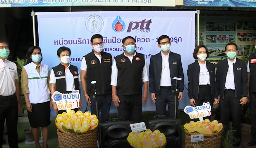 ด้านซีอีโอ ปตท. คุณอรรถพล ฤกษ์พิบูลย์ กล่าวว่ากลุ่ม ปตท. ได้ร่วมวางระบบงานดิจิทัล และเครื่องมืออิเล็กทรอนิกส์ต่างๆ และสนับสนุนพนักงานกลุ่ม ปตท. ร่วมเป็นจิตอาสา ช่วยบริหารจัดการคิวผู้เข้ารับวัคซีน ประสานงาน อำนวยความสะดวกแก่ประชาชนและบุคลากรทางการแพทย์ นอกจากนี้ยังร่วมสนับสนุนอาหาร น้ำดื่มแก่เจ้าหน้าที่ บุคลากรทางการแพทย์ในหน่วยต่าง ๆ อีกทั้งจัดเตรียมสินค้าวิสาหกิจชุมชนจากโครงการ ‘ชุมชนยิ้มได้’ ที่ ปตท.ได้ส่งเสริมการฟื้นฟูเศรษฐกิจในภาคเกษตรกร มอบให้กับประชาชนที่มาฉีดวัคซีนอีกด้วย ซึ่งวานนี้ ได้จัดเตรียมข้าวสาร และมะม่วงมหาชนกให้กับประชาชนที่มาฉีดวัคซีน