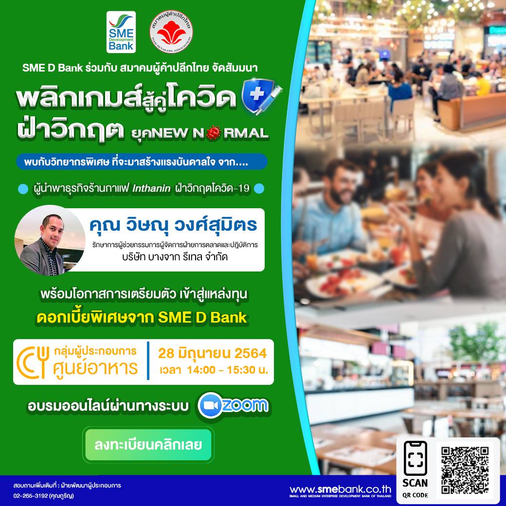 นางสาวนารถนารี รัฐปัตย์ กรรมการผู้จัดการ ธนาคารพัฒนาวิสาหกิจขนาดกลางและขนาดย่อมแห่งประเทศไทย (ธพว.) หรือ SME D Bank กล่าวว่า จากสถานการณ์โควิด-19 หนึ่งในกลุ่มเอสเอ็มอีที่ได้รับผลกระทบรุนแรง คือ ผู้ประกอบการร้านขายอาหาร และผู้ประกอบการร้านค้าปลีก ที่ตั้งอยู่ในฟู้ดคอร์ทตามศูนย์การค้า และห้างสรรพสินค้า ซึ่งส่วนใหญ่เป็นผู้ประกอบการรายย่อย มีข้อจำกัดด้านเงินทุนหมุนเวียนระยะยาว ดังนั้น SME D Bank ร่วมกับ สมาคมผู้ค้าปลีกไทย จัดกิจกรรมอบรมออนไลน์ หัวข้อ “พลิกเกมส์สู้คู่โควิด ฝ่าวิกฤตยุค NEW NORMAL” ผ่านระบบ Zoom Meeting เตรียมความพร้อม สนับสนุนให้ผู้ประกอบการกลุ่มธุรกิจดังกล่าว เข้าถึงแหล่งทุน ผ่านสินเชื่อดอกเบี้ยพิเศษของ SME D Bank เพื่อนำไปเสริมสภาพคล่อง ประคับประคองกิจการให้ผ่านช่วงเวลายากลำบากนี้ไปให้ได้ พร้อมรับฟังแนวคิดการพาธุรกิจผ่านอุปสรรคจากวิทยากร นายวิษณุ วงศ์สุมิตร รักษาการผู้ช่วยกรรมการผู้จัดการฝ่ายการตลาดและปฏิบัติการ บริษัท บางจาก รีเทล จำกัด ผู้นำธุรกิจร้านกาแฟ Inthanin ฝ่าวิกฤตโควิด-19 มาได้สำเร็จ
