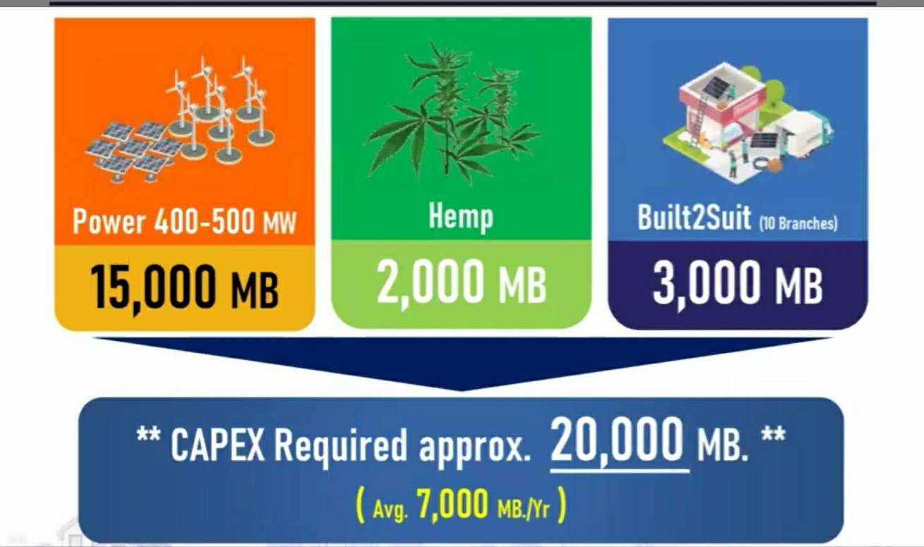 ทั้งนี้แผนงานลงทุน ปี 2564-2566 รวมอยู่ที่ 2 หมื่นล้านบาท แบ่งเป็น เงินลงทุนสำหรับธุรกิจไฟฟ้า 1.5 หมื่นล้านบาท เพื่อเพิ่มกำลังการผลิตใหม่ให้ได้ตามเป้าหมาย ส่วนที่เหลือจะเป็นเงินลงทุนในธุรกิจกัญชง 2 พันล้านบาท และธุรกิจ Built2Suit อีกประมาณ 3 พันล้านบาท ส่วนธุรกิจก่อสร้าง หรือ EPC ปัจจุบันมีงานในมือ 5.8 พันล้านบาท และในช่วงที่เหลือของปีนี้ ยังมีวงเงินต้องเข้าประมูลอีกประมาณ 2 หมื่นล้านบาท คาดว่าในช่วง 6 เดือนถึง 1 ปี บริษัทจะมีงานเพิ่มขึ้นเป็น 7-8 พันล้านบาท