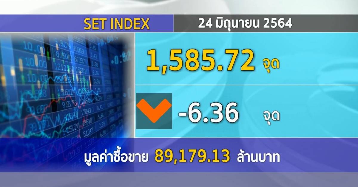 กทม. 24 มิ.ย.-ตลาดหลักทรัพย์ ปิดวันนี้ที่ระดับ 1,585.72 จุด ลดลง 6.36 จุด (-0.40%) มูลค่าการซื้อขาย 89,179.13 ล้านบาท กังวลล็อกดาวน์บางพื้นใน กทม. หลังโควิดระบาดหนัก การเมืองรบกวน