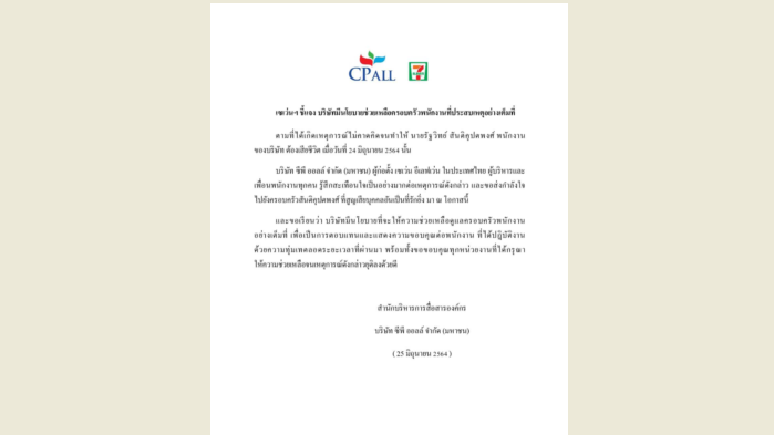 บริษัท ซีพี ออลล์ จำกัด (มหาชน)แจ้งว่าตามที่ได้เกิดเหตุการณ์ไม่คาดคิดจนทำให้ นายรัฐวิทย์ สันติคุปตพงศ์ พนักงานของบริษัทต้องเสียชีวิต เมื่อวันที่ 24 มิถุนายน 2564 นั้น บมจ.ซีพี ออลล์ ผู้บริหารและเพื่อนพนักงานทุกคน รู้สึกสะเทือนใจเป็นอย่างมากต่อเหตุการณ์ดังกล่าว และขอส่งกำลังใจ ไปยังครอบครัวสันติคุปตพงศ์ ที่สูญเสียบุคคลอันเป็นที่รักยิ่ง มา ณ โอกาสนี้
