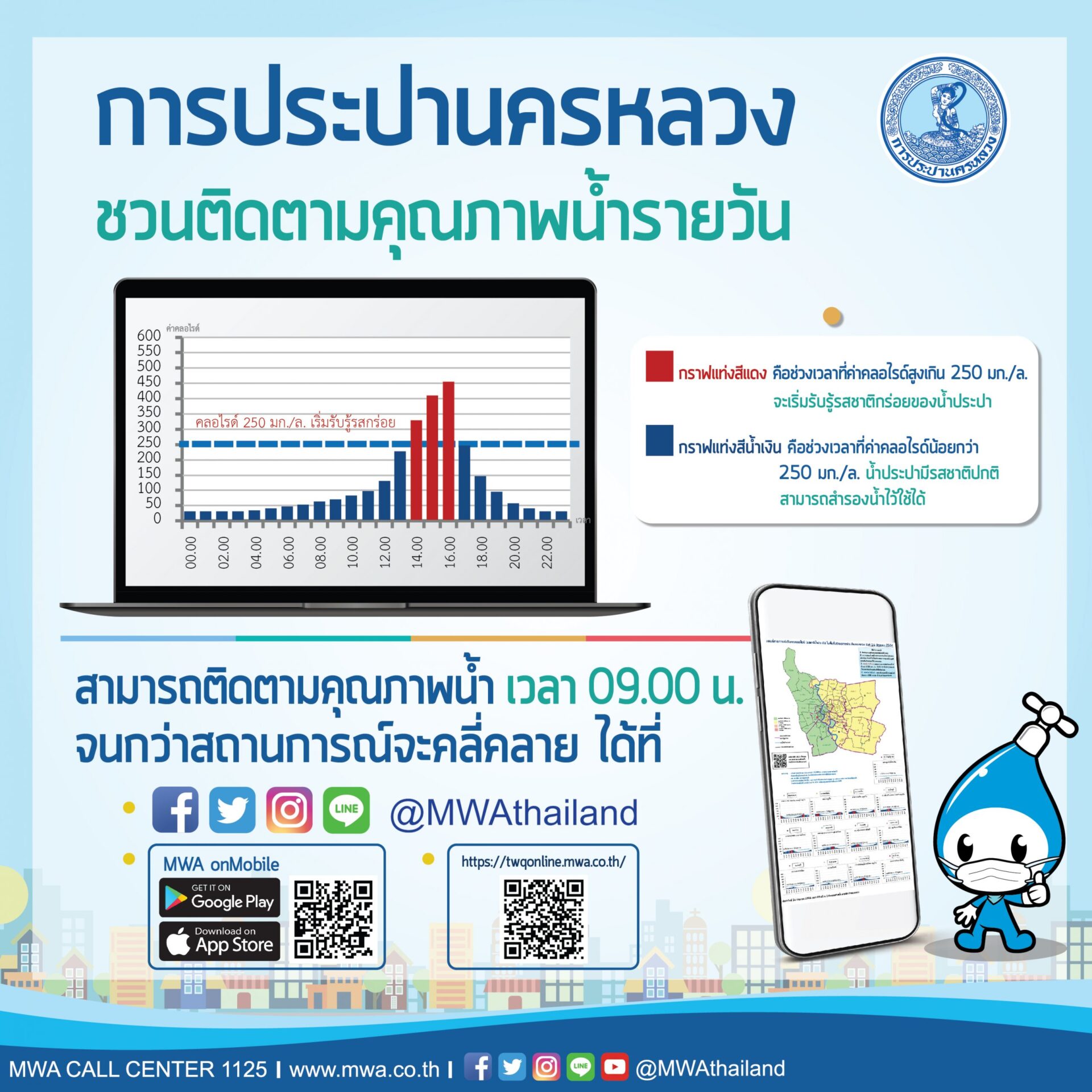 ขณะนี้ กปน.ได้แจ้งรายงานภาพรวมการคาดการณ์คุณภาพน้ำประปาในเขตพื้นที่กรุงเทพมหานคร นนทบุรี และสมุทรปราการ ผ่านช่องทางโซเชียลของ กปน. (Facebook / Line / Twitter / Instagram @MWAthailand) ทุกวัน จนกว่าสถานการณ์คุณภาพน้ำจะคลี่คลาย เพื่อให้ประชาชนสามารถสำรองน้ำในช่วงปกติ (ค่าคลอไรด์ไม่เกิน 250 มก./ล.) ไว้สำหรับการบริโภค และขอให้กลุ่มเสี่ยง ได้แก่ ผู้ที่เป็นโรคไต โรคหัวใจ โรคความดันสูง โรคเบาหวาน ผู้สูงอายุ เด็กเล็ก และสัตว์เลี้ยงขนาดเล็ก ควรหลีกเลี่ยงการบริโภคบางช่วงเวลา หรือสามารถนำภาชนะมารับน้ำประปาดื่มได้ฟรี ที่สำนักงานประสาขาใกล้บ้าน และประชาชนยังสามารถดูคุณภาพน้ำประปาแบบ real-time ได้ทางแอปพลิเคชัน MWA onMobile และเว็บไซต์ https://twqonline.mwa.co.th/ ได้ตลอด 24 ชั่วโมง