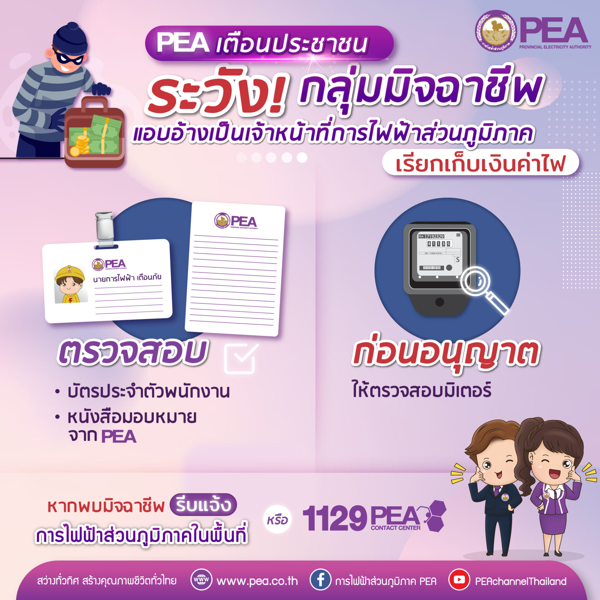 การไฟฟ้าส่วนภูมิภาค (PEA) ขอแจ้งเตือนประชาชนให้ระมัดระวังกลุ่มมิจฉาชีพ ที่แอบอ้างเป็นเจ้าหน้าที่ของการไฟฟ้าส่วนภูมิภาค ดำเนินการเรียกเก็บเงินค่าไฟฟ้าและเตือนอย่าหลงเชื่อกลุ่มมิจฉาชีพดังกล่าว พร้อมแนะนำให้ประชาชนเรียกตรวจสอบบัตรประจำตัวพนักงานของการไฟฟ้าส่วนภูมิภาคและหนังสือมอบหมายจากการไฟฟ้าส่วนภูมิภาค ก่อนอนุญาตให้เข้าตรวจสอบมิเตอร์ไฟฟ้าทุกครั้ง