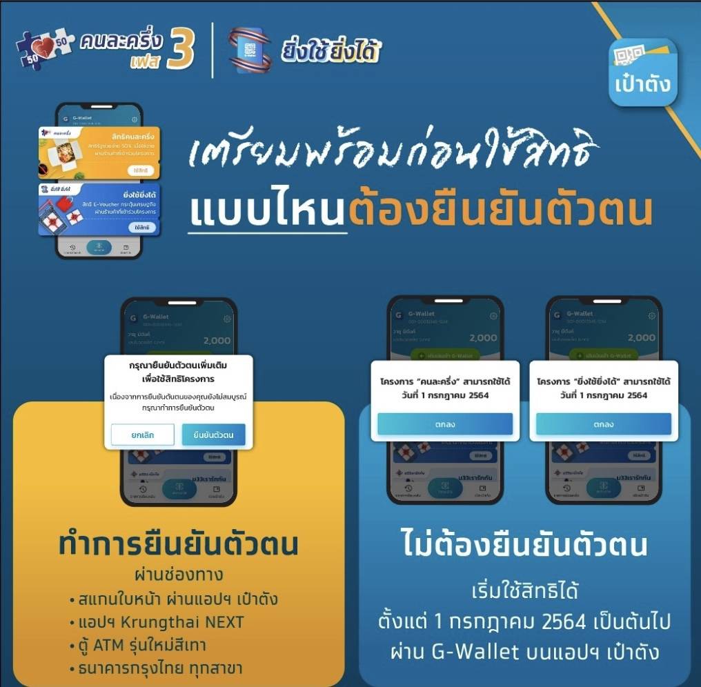 ทั้งนี้ ผู้รับสิทธิรายใหม่ จะต้องดำเนินการยืนยันตัวตนทุกคน ส่วนผู้รับสิทธิรายเดิมบางคน อาจจะต้องยืนยันตัวตนเพิ่มเติมอีกครั้ง โดยเมื่อกดเข้า G-wallet ระบบจะขึ้นข้อความว่า “กรุณายืนยันตัวตนเพิ่มเติม เพื่อใช้สิทธิในโครงการ เนื่องจากการยืนยันตัวตนของคุณยังไม่สมบูรณ์” ให้ยืนยันตัวตน โดยสแกนใบหน้า ผ่านแอปฯ เป๋าตัง หรือแอปฯ Krungthai NEXT หรือ นำบัตรประชาชนไปยืนยันตัวตนที่ ตู้ ATM กรุงไทยสีเทา หรือ ธนาคารกรุงไทยทุกสาขาทั่วประเทศ