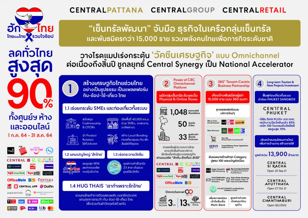 กรุงเทพฯ 29 มิ.ย.-“เซ็นทรัลพัฒนา” จับมือธุรกิจในเครือกลุ่มเซ็นทรัล นำโดยเซ็นทรัล รีเทลและพันธมิตรกว่า 15,000 ราย รวมพลังคนไทยเพื่อภารกิจระดับชาติ วางโรดแมปเร่งกระตุ้น ‘วัคซีนเศรษฐกิจ แบบ Omnichannel’ ทุ่มงบ 120 ล้านบาท ประเดิมแคมเปญใหญ่ “ฮักไทย ไทยช่วยไทย รวมใจช้อป” ทั่วประเทศ เริ่ม ก.ค. ถึง ส.ค. 64