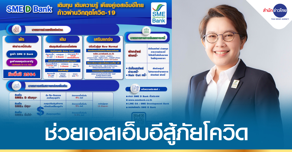 น.ส.นารถนารี รัฐปัตย์ กรรมการผู้จัดการ ธนาคารพัฒนาวิสาหกิจขนาดกลางและขนาดย่อมแห่งประเทศไทย (ธพว.) หรือ SME D Bank เปิดเผยว่า นับตั้งแต่เกิดสถานการณ์การแพร่ระบาดของโควิด-19 เมื่อช่วงต้นปี 2563 ที่ผ่านมา ธนาคารตระหนักดีถึงความเดือดร้อนที่เอสเอ็มอีได้รับ จึงดำเนินมาตรการเชิงรุกช่วยเหลือมาอย่างต่อเนื่อง ภายใต้แนวคิดช่วยเหลือโดยเติมทุนควบคู่กับเติมความรู้ เพื่อให้เอสเอ็มอีมีเงินทุนไปเสริมสภาพคล่องประคับประคองธุรกิจ ขณะเดียวกันยังเป็นการวางรากฐานให้สามารถปรับตัวเข้าสู่โลกธุรกิจยุค New Normal