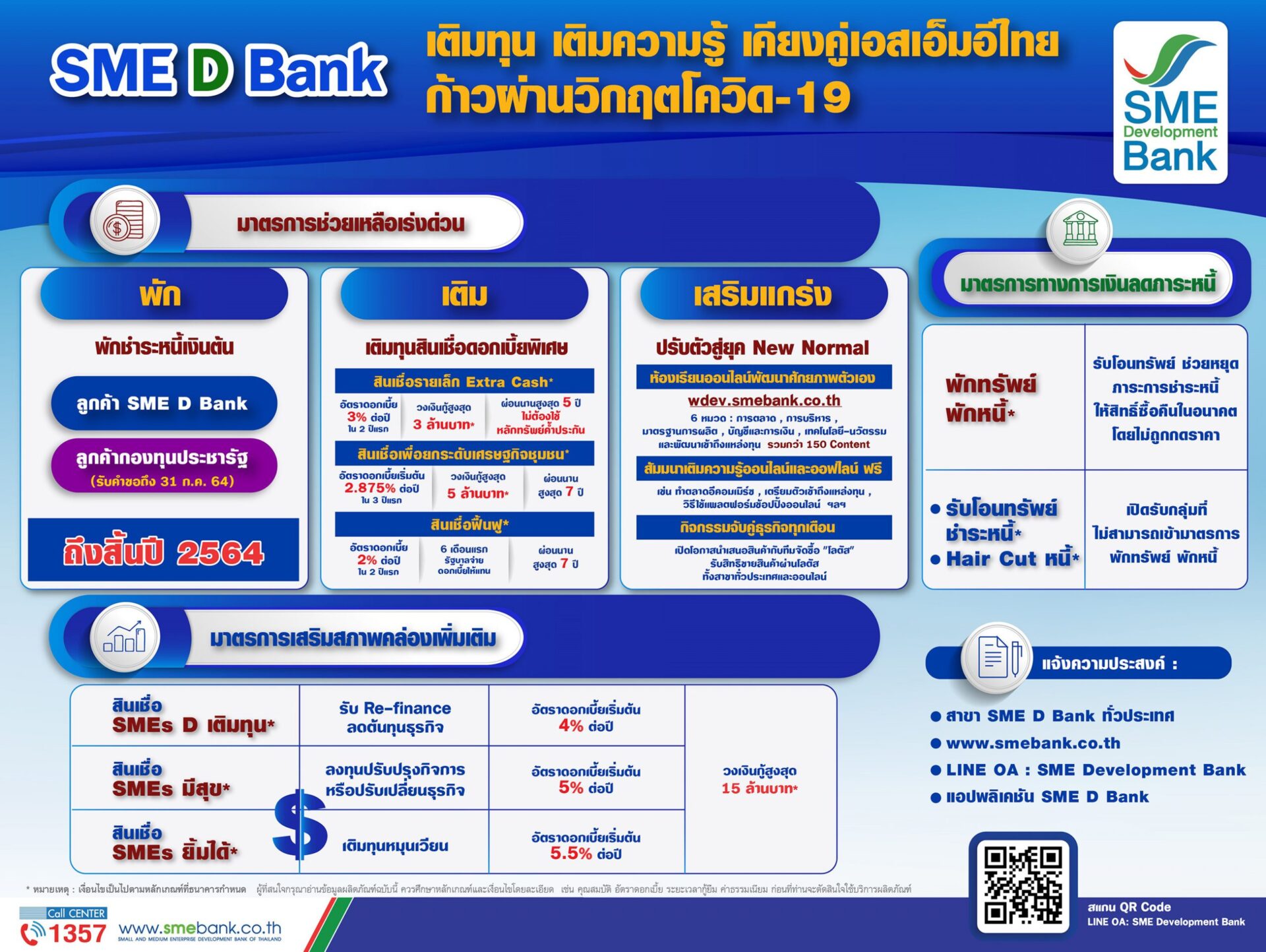 และ “มาตรการเสริมแกร่ง” เพิ่มศักยภาพให้เอสเอ็มอีปรับตัวสู่ยุค New Normal เช่น หลักสูตรห้องเรียนออนไลน์ ให้ผู้ประกอบการเข้าไปเรียนรู้พัฒนาศักยภาพตัวเองที่เว็บไซต์ wdev.smebank.co.th โดยมี 6 หมวดหลัก : การตลาด, การบริหาร, มาตรฐานการผลิต, บัญชีและการเงิน, เทคโนโลยี-นวัตรรม และพัฒนาเข้าถึงแหล่งทุน เนื้อหากว่า 150 Content ขณะนี้มีผู้เข้าใช้บริการแล้วกว่า 21,000 ราย จัดกิจกรรมสัมมนาเติมความรู้ออนไลน์และออฟไลน์ต่อเนื่อง และกิจกรรมจับคู่ธุรกิจ (Business Matching) กับ “โลตัส” เริ่มตั้งแต่เดือนพฤษภาคมถึงพฤศจิกายน 2564 เปิดโอกาสให้เอสเอ็มอีนำเสนอสินค้าต่อทีมจัดซื้อ “โลตัส” โดยตรง หากได้รับคัดเลือกจะได้สิทธิวางขายสินค้าผ่านโลตัส ทั้งสาขาทั่วประเทศและออนไลน์ ขณะนี้จัดมาแล้ว 2 ครั้ง คือเดือนพฤษภาคม และมิถุนายน 2564 มีเอสเอ็มอีได้นำเสนอสินค้าไปแล้วกว่า 160 ราย