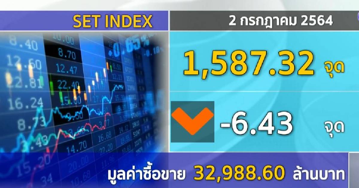 กทม. 2 ก.ค.-ตลาดหุ้นไทยภาคเช้า ดัชนีติดลบเล็กน้อยแม้มีแรงหนุนหุ้นกลุ่มพลังงานจากราคาน้ำมันดิบพุ่งเหนือ 75 ดอลลาร์ต่อบาร์เรล แต่ตัวเลขติดเชื้อโควิดในประเทศอยู่ระดับสูง ฉุดความเชื่อมั่นการลงทุน ช่วงเที่ยงดัชนีอยู่ที่ 1,587.32 จุด ลดลง 6.43 จุด มูลค่าซื้อขาย 32,988.60 ล้านบาท