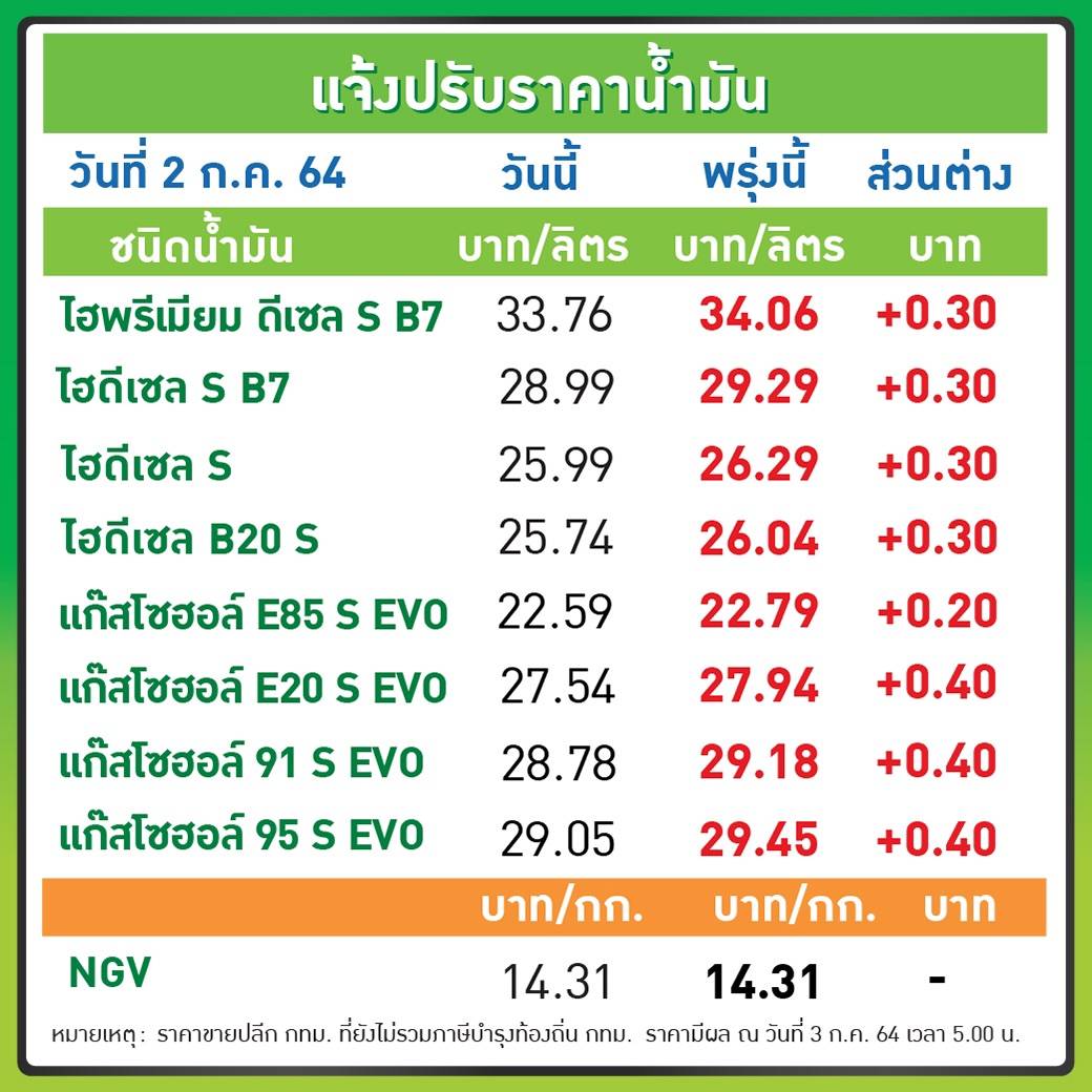 โดยราคาขายปลีกจะเป็นดังนี้ ULG = 36.86, GSH95 = 29.45, E20 = 27.94, GSH91 = 29.18, E85 = 22.79, HSD- B7 = 29.29, HSD-B10 = 26.29, HSD-B20 = 26.04, ดีเซลพรีเมียม B7 = 34.06 บาท/ลิตร โดยราคาขายปลีกข้างต้นยังไม่รวมภาษีบำรุงกรุงเทพมหานคร. – สำนักข่าวไทย