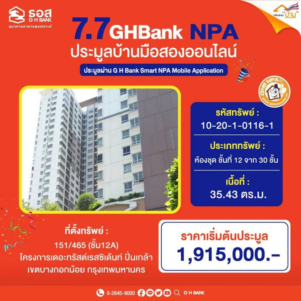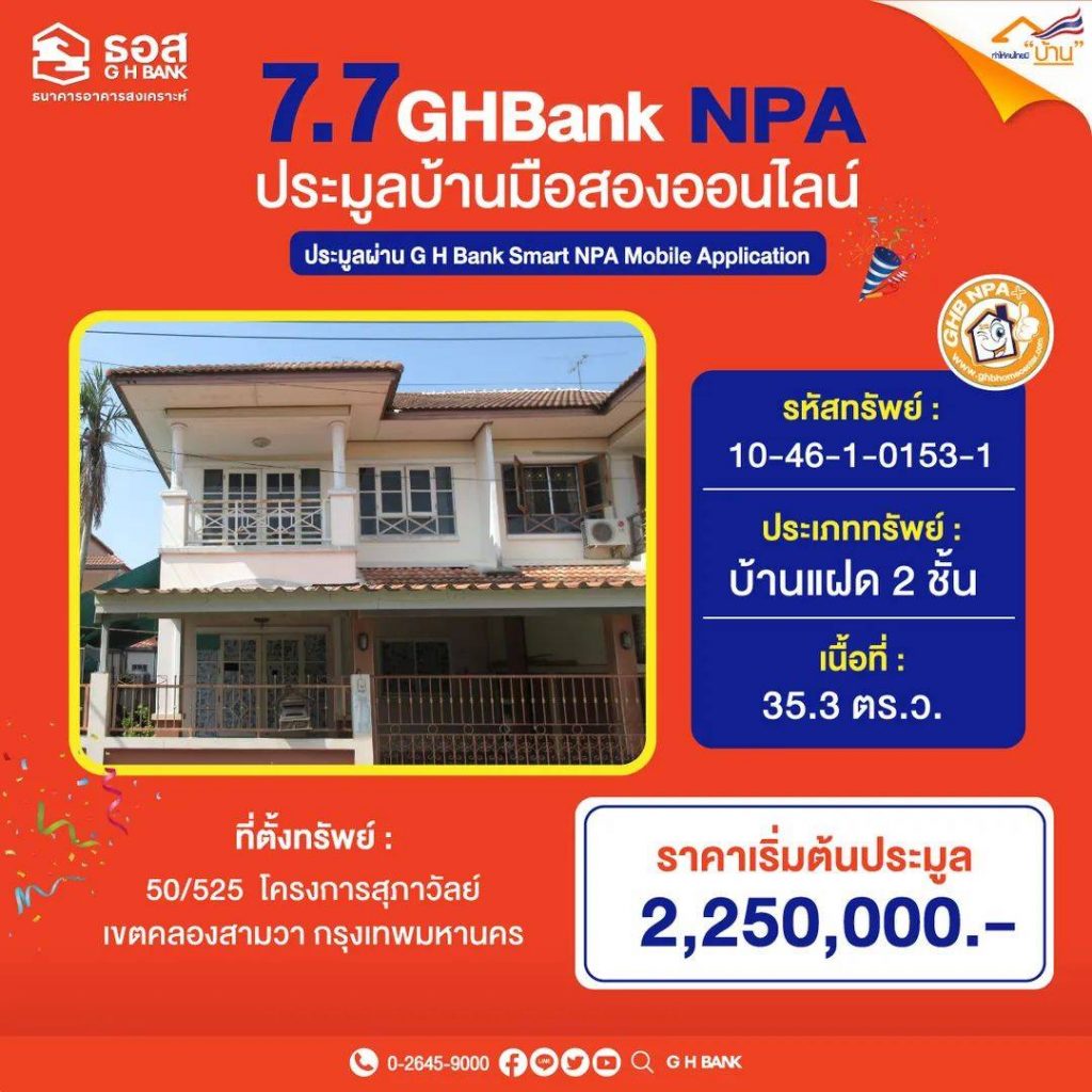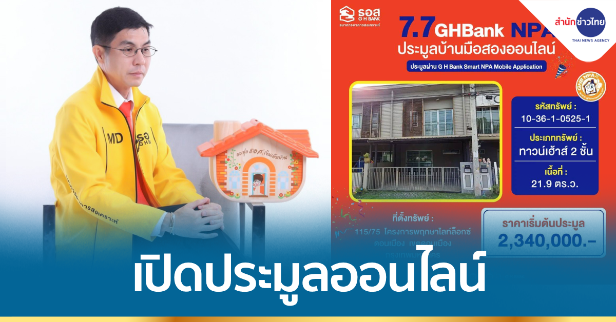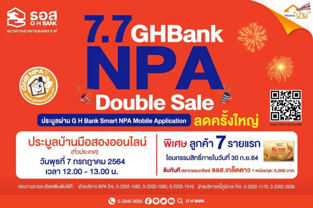 ธนาคารอาคารสงเคราะห์ จัดแคมเปญพิเศษ “7.7 บ้านมือสอง Double Sale Double Promotion” ประมูลบ้านมือสองออนไลน์ผ่าน Application : G H Bank Smart NPA คัดสรรทรัพย์ใหม่สภาพดี ราคาโดนใจ 77 รายการทั่วประเทศ มาจัดประมูลออนไลน์ ราคาเริ่มต้นประมูลลดสูงสุดถึง 40% ราคาเริ่มต้นต่ำสุดแค่ 250,000 บาท พิเศษ!! สำหรับลูกค้า 7 รายแรก ที่ชนะประมูลและโอนกรรมสิทธิ์ภายในวันที่ 30 กันยายน 2564 ได้รับฟรี!! สลากออมทรัพย์ ธอส. ชุดเกล็ดดาว มูลค่า 5,000 บาท เพื่อลุ้นรับรางวัลมูลค่าสูงสุดถึง 1 ล้านบาททุกเดือน เลือกใช้โปรโมชั่นผ่อนดาวน์ดอกเบี้ย 0% นานสูงสุด 48 เดือน เริ่มประมูลพร้อมกันวันพุธที่ 7 กรกฎาคม 2564 เวลา 12.00-13.00 น.