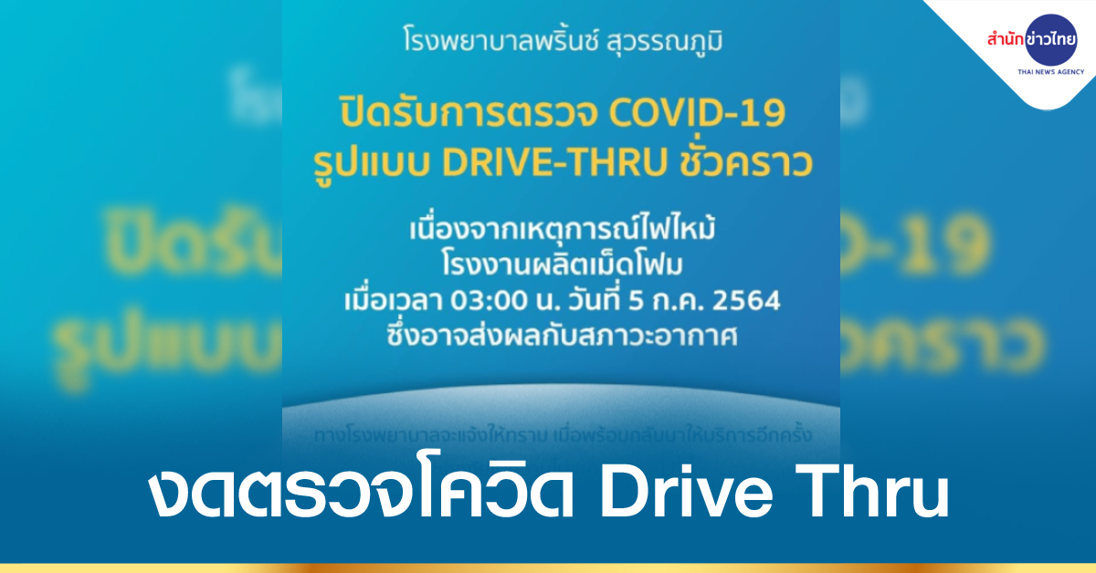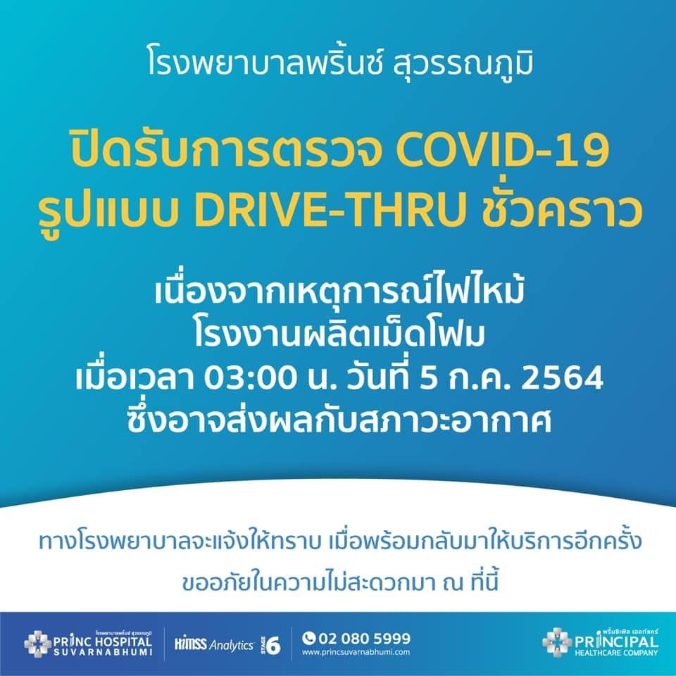 สมุทรปราการ 5 ก.ค. – รพ.พริ้นซ์ สุวรรณภูมิ แจ้งงดบริการตรวจ COVID-19 Drive Thru หลังไฟไหม้โรงงานย่านกิ่งแก้ว