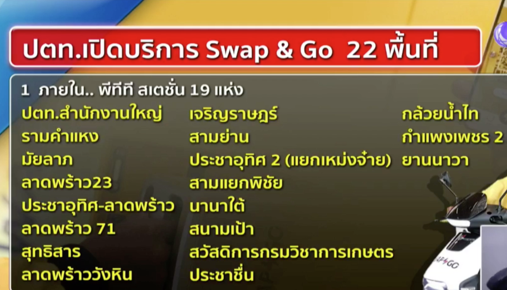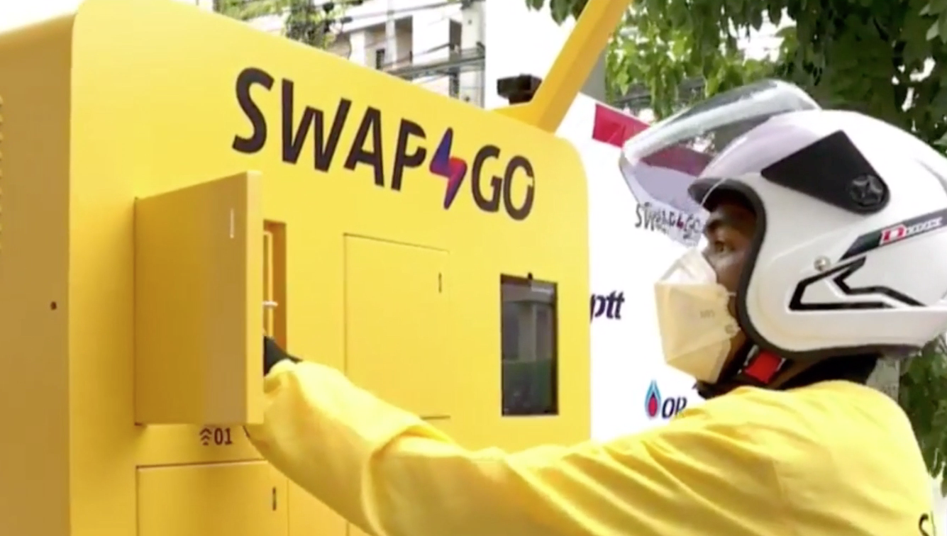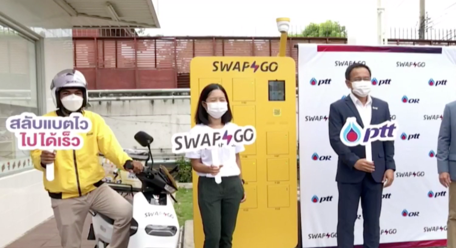 เปิดตู้สลับแบตเตอรี่นำแบตใหม่ไปใช้โดยไม่ต้องรอชาร์จ คือข้อได้เปรียบของ “SWAP & GO” ต้นแบบนวัตกรรมและเทคโนโลยีด้านพลังงานที่จะช่วยขับเคลื่อนประเทศให้เปลี่ยนผ่านสู่สังคมยานยนต์ไฟฟ้ามากยิ่งขึ้น “SWAP & GO” เป็นบริษัทในเครือ ปตท. ที่ให้บริการสลับแบตเตอรี่สำหรับผู้ใช้งานมอเตอร์ไซค์ไฟฟ้าแบบไม่ต้องรอชาร์จ ปัจจุบันมีสถานีสลับแบตเตอรี่ 22 แห่งทั่วกรุงเทพฯ โดยตั้งอยู่ภายในสถานีบริการน้ำมัน พีทีที สเตชั่น 19 แห่ง และภายนอก อีก 3 แห่ง นำร่องให้บริการลูกค้าในกลุ่ม Delivery Service