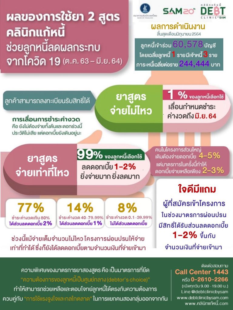 ผลของมาตรการยา 2 สูตร เพื่อช่วยเหลือลูกหนี้ของโครงการคลินิกแก้หนี้ในช่วงเดือนตุลาคม 2563 ถึงมิถุนายน 2564 “สูตรจ่ายเท่าที่ไหว” ผ่อนปรนและจูงใจให้ลูกหนี้ชำระหนี้ตามความสามารถ ยิ่งชำระมาก จะได้ส่วนลดดอกเบี้ยมากขึ้น ผลของยาสูตรจ่ายเท่าที่ไหวแสดงให้เห็นว่า การได้รับส่วนลดดอกเบี้ยเป็นแรงจูงใจที่สำคัญ ทำให้ลูกหนี้ยังคงพยายามชำระหนี้อย่างต่อเนื่อง ทั้งนี้ ในภาพรวมลูกหนี้ร้อยละ 99 ยังคงชำระค่างวดได้ โดยลูกหนี้จำนวน 14,044 ราย (ร้อยละ 77) ชำระหนี้เฉลี่ยร้อยละ 80 ขึ้นไป ของค่างวด ได้ส่วนลดดอกเบี้ย 2% และจำนวน 2,467 ราย (ร้อยละ 14) ชำระหนี้เฉลี่ยร้อยละ 40-79.99 ของค่างวด ได้ส่วนลดดอกเบี้ย 1% ส่วนจำนวน 1,520 ราย (ร้อยละ 8) ชำระค่าหนี้น้อยกว่าร้อยละ 40 ของค่างวด จะไม่ได้รับส่วนลดดอกเบี้ย สำหรับลูกหนี้ที่ใช้ยา “สูตรจ่ายไม่ไหว” ที่ไม่ชำระค่างวดเลยมีเพียง 192 รายเท่านั้น (คิดเป็นร้อยละ 1)
