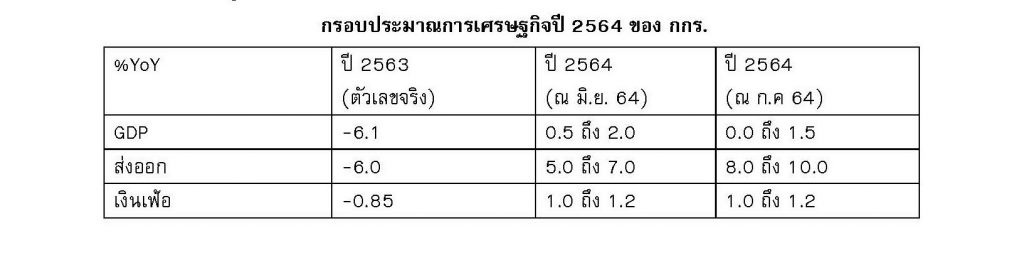 ด้านการส่งออก คาดว่าจะขยายตัว 8-10 % เพิ่มขึ้นจากประมาณการเดิม 3% เนื่องจากเศรษฐกิจโลกที่ฟื้นตัวดีกว่าคาด ภายใต้เงื่อนไขสามารถควบคุมการระบาดในกลุ่มแรงงานภาคอุตสาหกรรมได้ และการฉีดวัคซีนให้แรงงานภายใต้ ม.33 ได้ทั่วถึง ส่วนอัตราเงินเฟ้อทั่วไปจะอยู่ในกรอบ 1- 1.2%