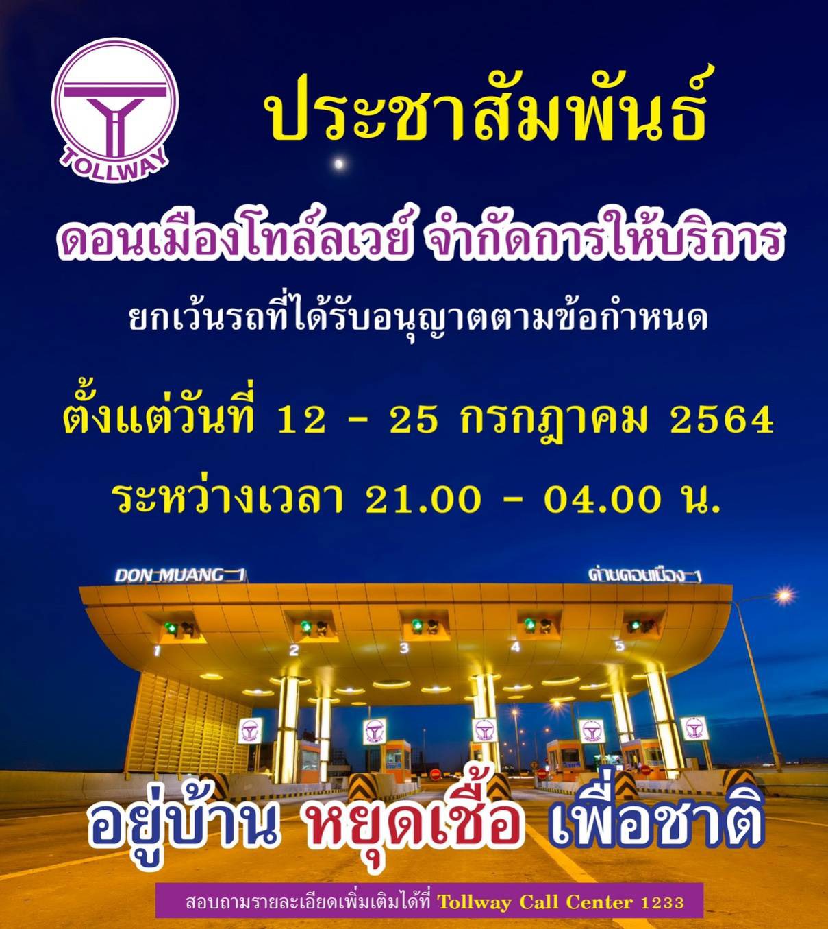 กรุงเทพฯ 12 ก.ค.-ดอนเมืองโทลล์เวย์ งดให้บริการ ตั้งแต่เวลา 21.00 -04.00 น. ตั้งแต่ 12 -25 กรกฎาคม นี้ ยกเว้นรถที่มีความจำเป็น ตามประกาศ ศบค.