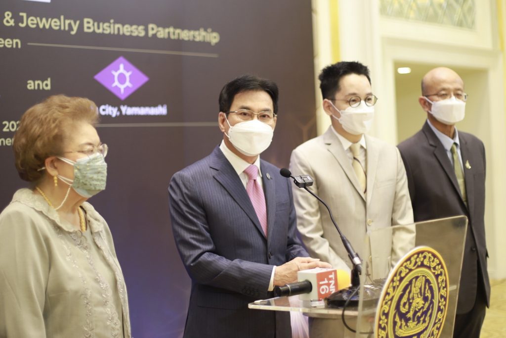 นายยูอิชิ ฮิงุชิ นายกเทศมนตรีเมืองโคฟุ กล่าวผ่านระบบถ่ายทอดสัญญาณสดจากประเทศญี่ปุ่นว่า เมืองโคฟุมีประชากรราว 190,000 คนถือเป็นศูนย์กลางด้านการเมืองเศรษฐกิจและวัฒนธรรมของจังหวัดยามานาชิ เมืองโคฟุเป็นแหล่งผลิตผลึกแก้วคริสตัลที่มีการพัฒนาการเจียระไนและแปรรูปให้เป็นแหล่งแปรรูปอัญมณี เมืองโคฟุเป็นศูนย์กลางแห่งอัญมณีและเครื่องประดับ โดยก่อนนี้ในปี 2562 ตนได้มีโอกาสเดินทางมาประเทศไทยและได้ก็จัดกิจกรรมจับคู่ธุรกิจที่กรุงเทพเพื่อประชาสัมพันธ์เครื่องประดับของเมืองโคฟุให้เป็นที่รู้จักมากขึ้น แม้ปัจจุบันจะมีสถานการณ์การแพร่ระบาดของโควิดที่ส่งผลต่อการเดินทางระหว่างประเทศ แต่การลงนาม MOU ในวันนี้จะช่วยเป็นแรงผลักดันในการพัฒนาอุตสาหกรรมเครื่องประดับทั้งไทยและเมืองโคฟุมากยิ่งขึ้นต่อไป และหวังว่าสถานการณ์การแพร่ระบาดของโควิดจะคลี่คลายโดยเร็วและอุตสาหกรรมจิวเวลรี่ของสองประเทศจะพัฒนามากยิ่งขึ้นต่อไป.-สำนักข่าวไทย
