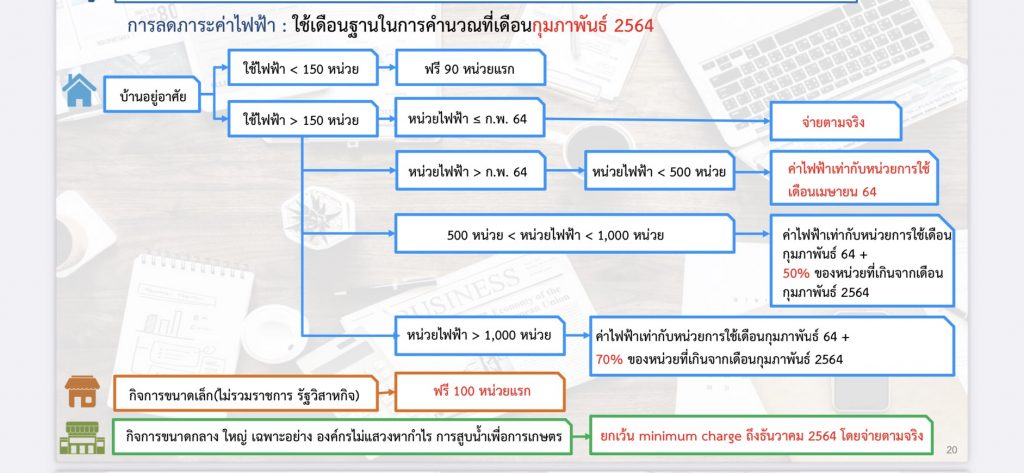 -บ้านอยู่อาศัยที่ใช้ไฟฟ้าเกิน 150 หน่วย/เดือน : กรณีน้อยกว่าหรือเท่ากับเดือน ก.พ. 64 คิดค่าไฟฟ้าตามหน่วยการใช้ไฟฟ้าจริง กรณีมากกว่าเดือนก.พ. แต่ไม่เกิน 500 หน่วย/เดือน ให้จ่ายเท่ากับเดือน ก.พ. 64 ผู้ใช้ไฟฟ้า 501-1,000 หน่วย/เดือน ให้จ่ายค่าไฟฟ้าเท่ากับเดือน ก.พ. 64 + 50% ของหน่วยไฟฟ้าที่เพิ่มจากเดือน ก.พ. 64 ผู้ใช้ไฟฟ้าเกิน 1,000 หน่วย/เดือน ให้จ่ายค่าไฟฟ้าเท่ากับเดือน ก.พ. 64 + 70% ของหน่วยไฟฟ้าที่เพิ่มจากเดือน ก.พ. 64 โดยให้เป็นส่วนลดค่าไฟฟ้าก่อนการคำนวณภาษีมูลค่าเพิ่ม