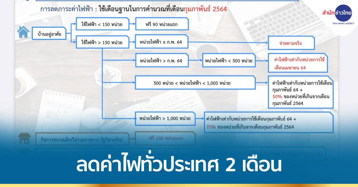 กรุงเทพฯ 13 ก.ค.-ลดค่าไฟฟ้าทั่วประเทศ 2 เดือน (ก.ค.-ส.ค.) ใช้เดือน ก.พ.64 เป็นฐานคำนวณ ร้านอาหารกิจการขนาดเล็ก ใช้ไฟฟรี 100 หน่วย/เดือน คาดใช้เงินงบฯ อุดหนุนรอบนี้ 1.2 หมื่นล้านบาท