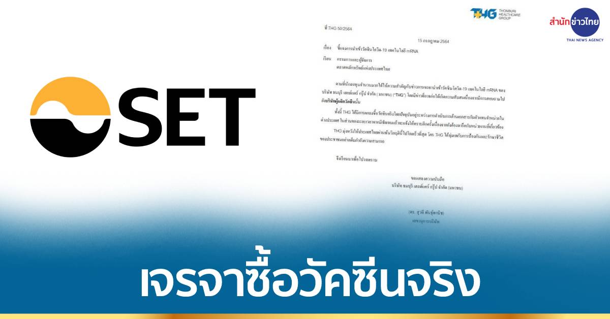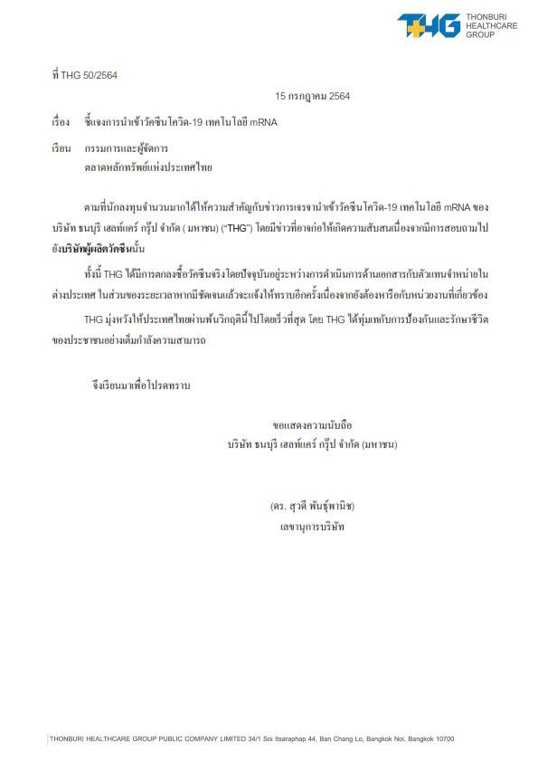 บมจ.ธนบุรีเฮลท์แคร์กรุ๊ป (THG) ชี้แจงต่อตลาดหลักทรัพย์ฯถึงข่าวการเจรจานำเข้าวัคซีนโควิด-19 เทคโนโลยี mRNA ว่า THG ได้มีการตกลงซื้อวัคซีนจริงโดยปัจจุบันอยู่ระหว่างการดำเนินการด้านเอกสารกับตัวแทนจำหน่ายในต่างประเทศในส่วนของระยะเวลาหากมีชัดเจนแล้วจะแจ้งให้ทราบอีกครั้งเนื่องจากยังต้องหารือกับหน่วยงานที่เกี่ยวข้อง