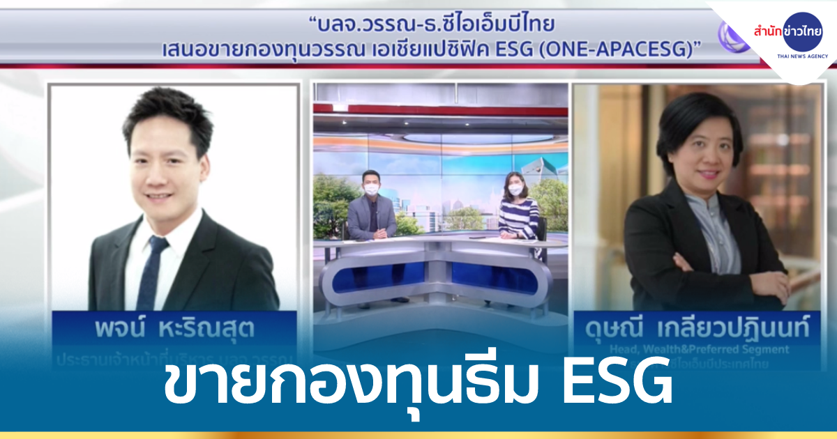 บลจ.วรรณ ร่วมมือกับธนาคารซีไอเอ็มบีไทย เสนอขายกองทุนธีม ESG ลงทุนแบบยั่งยืนผ่านกองทุนเปิด วรรณ เอเชียแปซิฟิค ESG (ONE-APACESG) เปิดเสนอขาย 19 ก.ค.- 4 ส.ค.นี้ พร้อมจัดโครงการ วรรณคืนกำไร ปันน้ำใจสู่สังคม ลงทุนผ่าน ONE-APACESG เป็นโครงการ CSR ที่นำยอดเงินลงทุน 1,000 บาท บริจาค 1 บาท ให้กระทรวงทรัพยากรธรรมชาติและสิ่งแวดล้อม