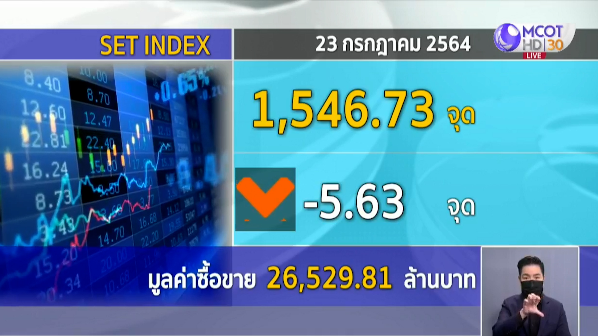 สำนักข่าวไทย 23 ก.ค.-หุ้นไทย เช้านี้เคลื่อนไหว แดนลบ ล่าสุดดัชนีอยู่ที่ 1,546.73 จุด -5.63 จุด มูลค่าการซื้อขาย 26,529.81 ล้านบาท แรงขายทำกำไรและวิตกการแพร่ระบาดของโควิด-19 ที่เร่งตัวขึ้นทั่วโลก