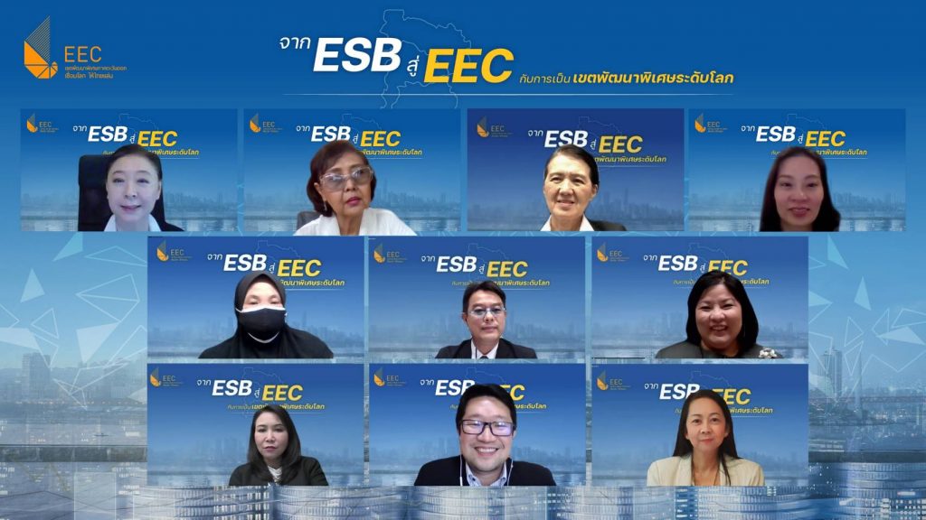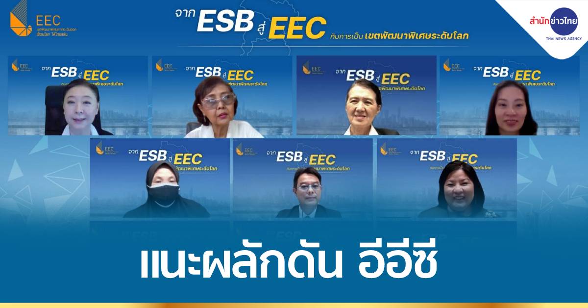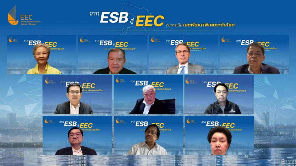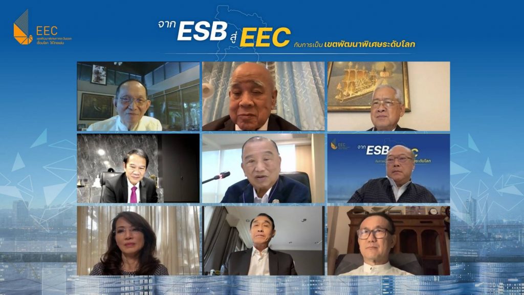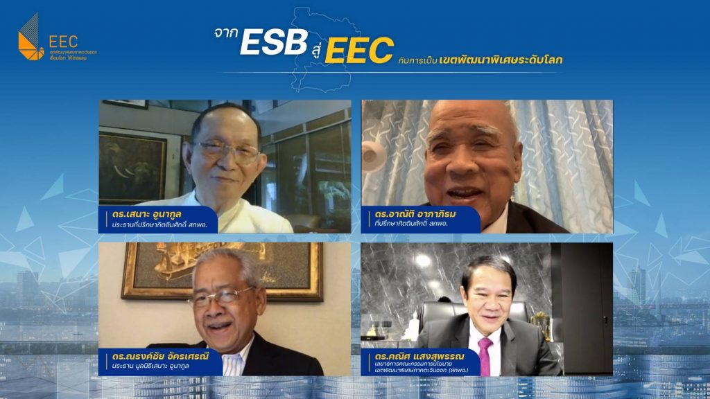 สำนักงานคณะกรรมการนโยบายเขตพัฒนาพิเศษภาคตะวันออก (สกพอ.) จัดเสวนาวิชาการ “จาก ESB สู่ EEC กับการเป็นเขตพัฒนาพิเศษระดับโลก” ในรูปแบบออนไลน์ (VDO conference) นำโดย ดร.เสนาะ อูนากูล ประธานที่ปรึกษากิตติมศักดิ์ สกพอ. ดร.อาณัติ อาภาภิรม ที่ปรึกษากิตติมศักดิ์ สกพอ. ดร.ณรงค์ชัย อัครเศรณี ประธานมูลนิธิเสนาะอูนากูล และ ดร.คณิศ แสงสุพรรณ เลขาธิการอีอีซี โดยมีกลุ่มผู้บริหารระดับสูงจากภาคเอกชน นักธุรกิจระดับ CEO ชั้นนำในเมืองไทย มาร่วมแสดงความเห็น เพื่อร่วมกันฉายภาพแนวคิดของการพัฒนาโครงการพัฒนาชายฝั่งทะเลตะวันออก หรือ “อีสเทิร์นซีบอร์ด” (ESB) และแผนพัฒนาเศรษฐกิจและสังคมแห่งชาติ ฉบับที่ 5 (พ.ศ.2525-2529) ช่วยให้เศรษฐกิจไทยในช่วงกว่า 30 ปีก่อนเติบโตแบบก้าวกระโดด เติบโตเฉลี่ยสูงถึง 9.3%