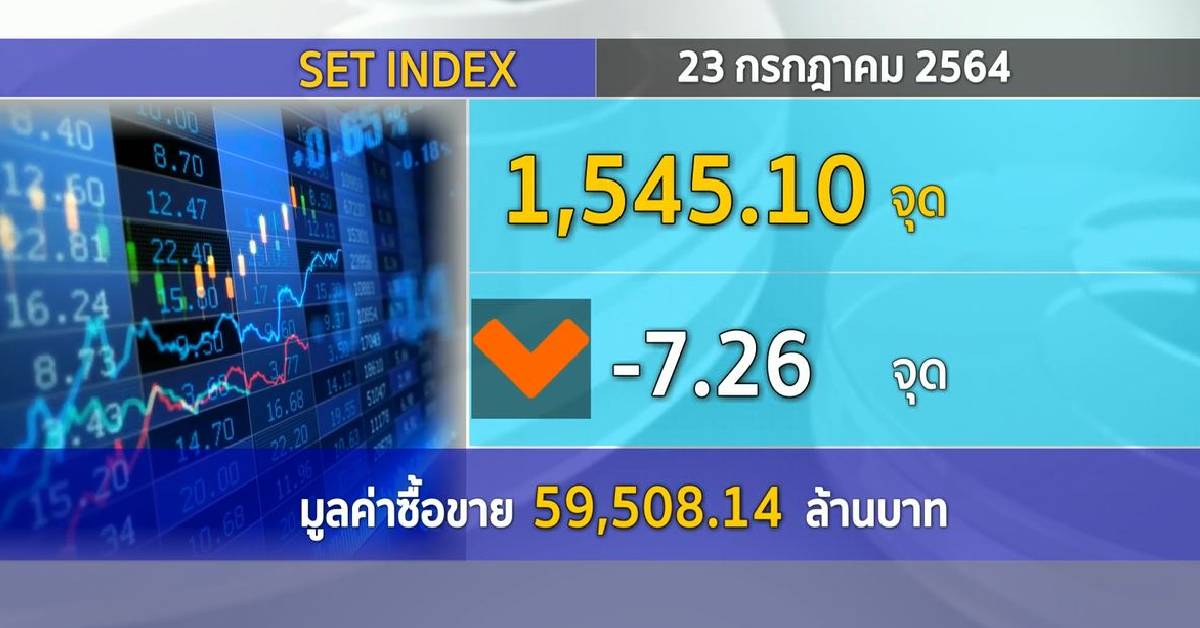 กทม. 23 ก.ค.-ตลาดหลักทรัพย์ ปิดวันนี้ที่ระดับ 1,545.10 จุด ลดลง 7.26 จุด (-0.47%) มูลค่าการซื้อขาย 59,508.14 ล้านบาท ตามตลาดเอเชีย หลังโควิดระบาดหนัก กดดันเศรษฐกิจ