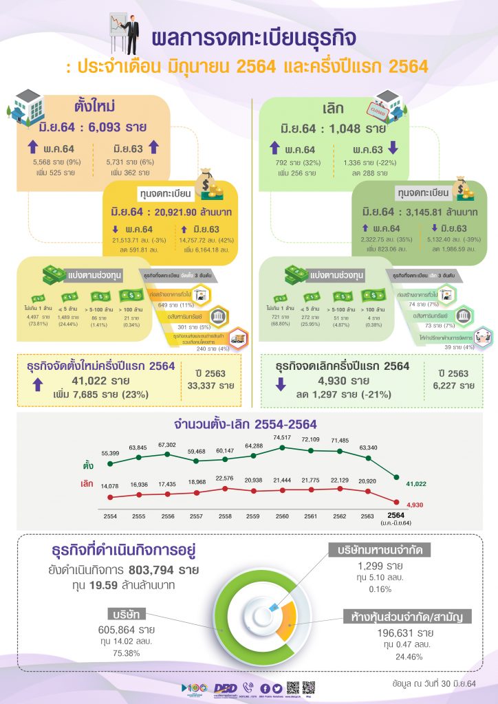 อย่างไรก็ตาม กรมพัฒนาธุรกิจการค้าได้วิเคราะห์การจดทะเบียนธุรกิจประจำเดือนมิถุนายน 2564 และครึ่งปี 2564 การจดทะเบียนจัดตั้งธุรกิจเดือนมิถุนายน 2564 มีการจดทะเบียนจัดตั้งธุรกิจใหม่จำนวน 6,093 ราย เพิ่มขึ้นร้อยละ 6 เมื่อเปรียบเทียบกับช่วงเดียวกันของปีที่ก่อนและการจดทะเบียนนิติบุคคลจัดตั้งธุรกิจใหม่ในครึ่งปีแรกของปี 2564 มีจำนวน 41,022 ราย เพิ่มขึ้นร้อยละ 23 เมื่อเปรียบเทียบกับช่วงเดียวกันของปีที่ก่อน ขณะที่การจดทะเบียนเลิกธุรกิจในเดือนมิถุนายน มีจำนวน 1,048 ราย ลดลง จากช่วงเดียวกันของเดือนก่อนหน้า ร้อยละ 22 และการจดทะเบียนเลิกในครึ่งปีแรกของปี 2564 มีจำนวน 4,930 ราย เทียบช่วงเวลาเดียวกันปี 2563 ลดลง ถึง ร้อยละ 21