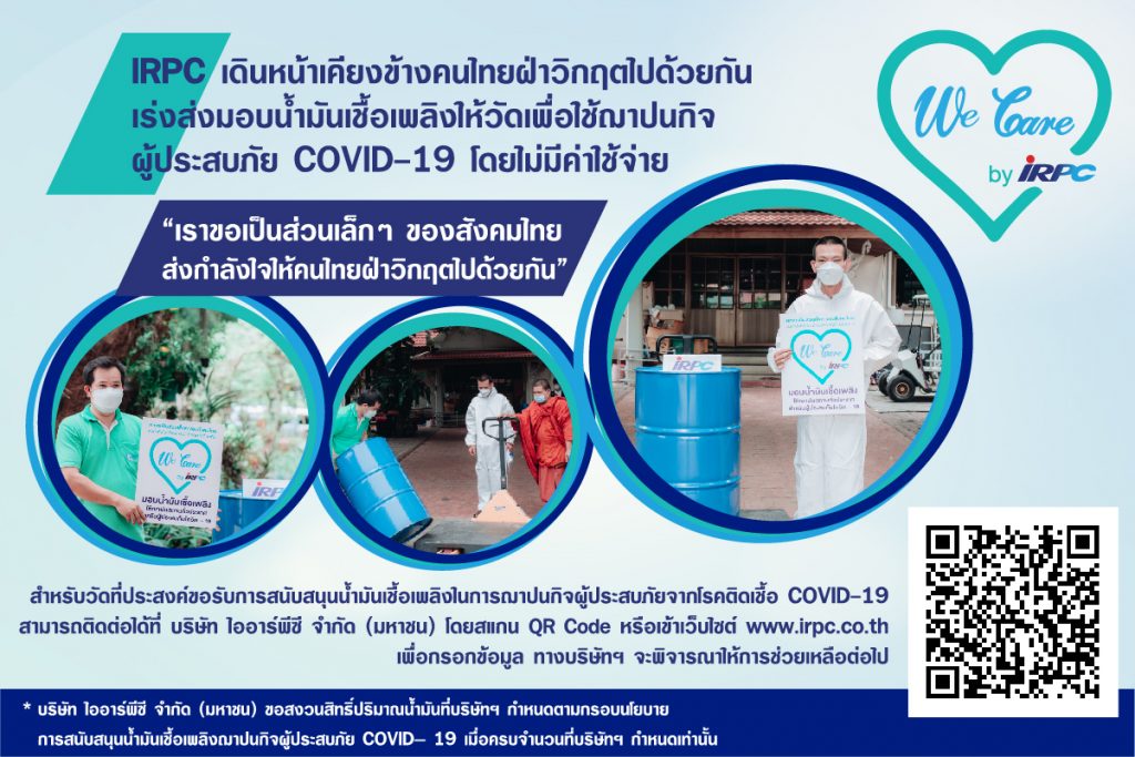 บริษัท ไออาร์พีซี จำกัด (มหาชน) หรือ IRPC ส่งมอบน้ำมันเชื้อเพลิง 18,000 ลิตร ให้แก่วัดในพื้นที่สีแดงเข้ม เขตกรุงเทพมหานครและปริมณฑล ไปแล้ว 90 แห่ง (ข้อมูล ณ วันที่ 22 ก.ค.64) เพื่อช่วยบรรเทาความเดือดร้อนจากการขาดแคลนน้ำมันเชื้อเพลิงในการประกอบพิธีฌาปนกิจผู้ประสบภัยจากโควิด-19 ตามโครงการ “We Care by IRPC เราขอเป็นส่วนเล็กๆ ของสังคมไทย ส่งกำลังใจให้คนไทยฝ่าวิกฤตไปด้วยกัน”