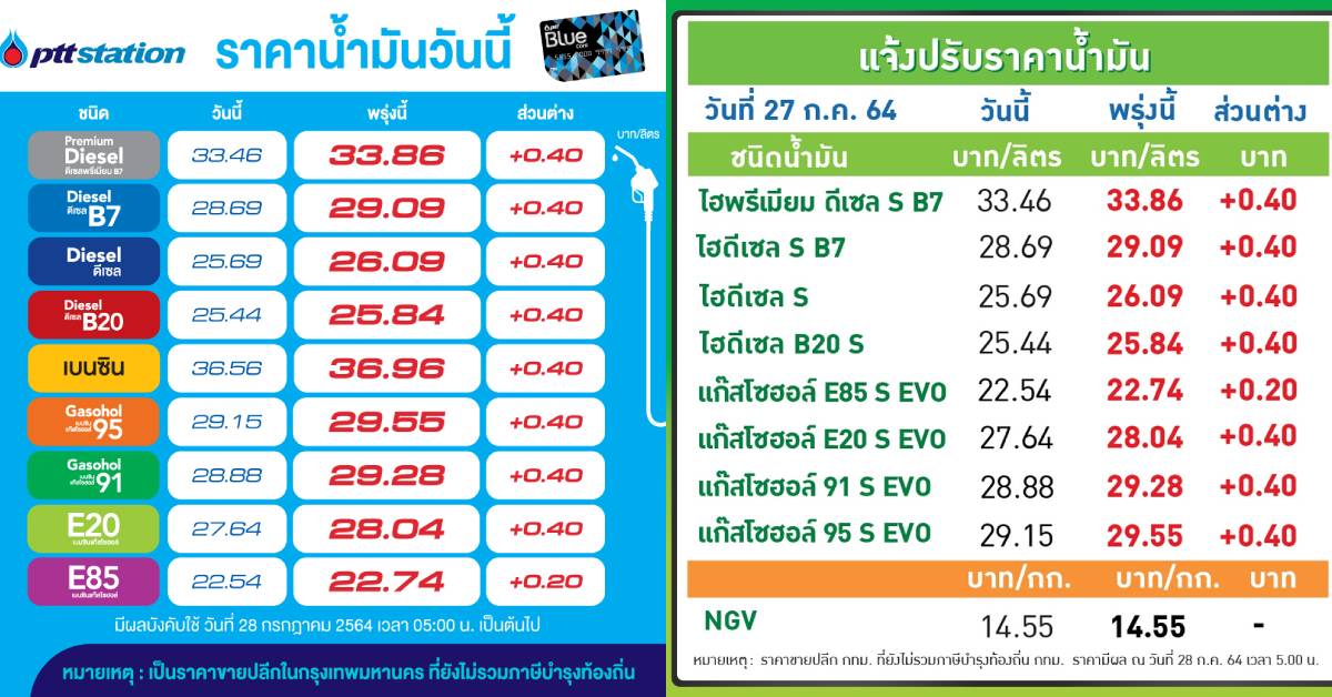 กทม. 27 ก.ค.-PTT Station – บางจากฯ ปรับราคาขายปลีกน้ำมันทุกชนิดขึ้น 0.40 บาทต่อลิตร เว้น E85 ปรับขึ้น 0.20 บาทต่อลิตร มีผล 28 ก.ค.64 เวลา 05.00 น. เป็นต้นไป โดยราคาขายปลีกจะเป็นดังนี้