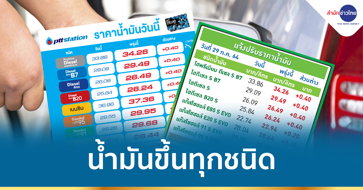 กทม. 29 ก.ค.-พรุ่งนี้ น้ำมันขึ้น ผู้ค้าน้ำมันแจ้งปรับราคาขายปลีกกลุ่มแก๊สโซฮอล์และดีเซล ทุกชนิด 40 สต./ลิตร ยกเว้น E85 ขยับขึ้น 20 สต./ลิตร