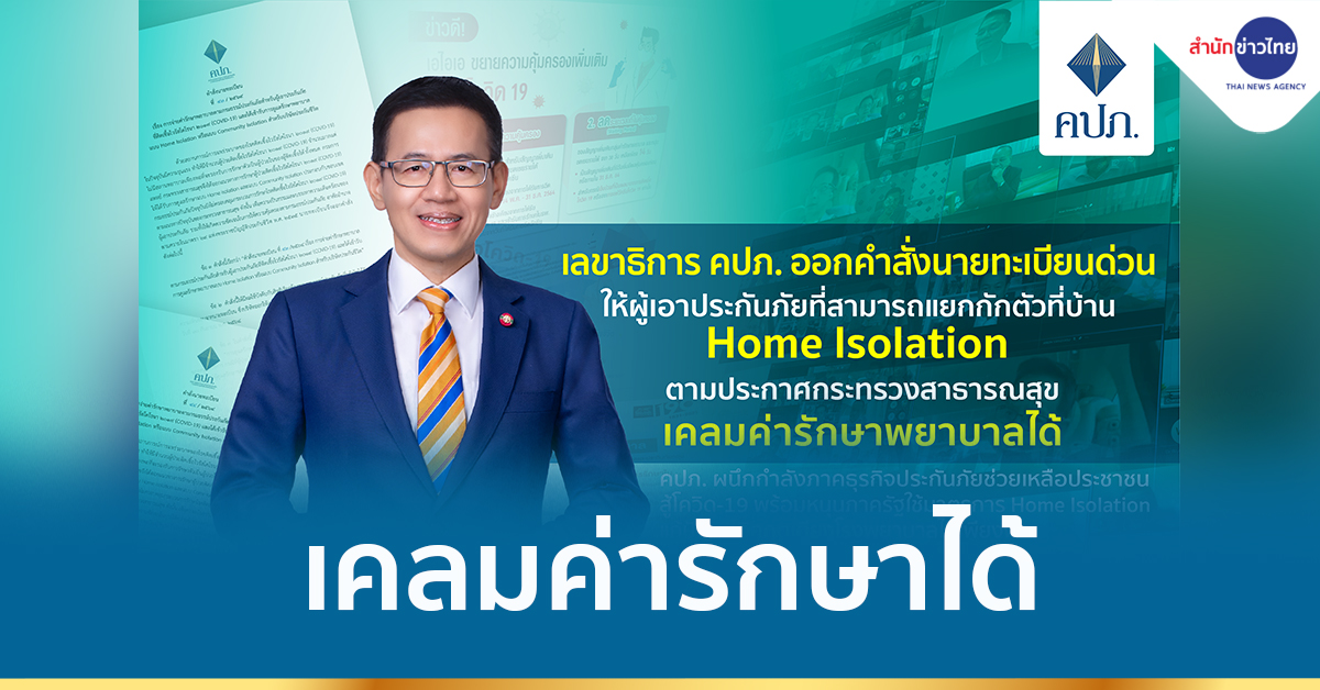 กทม. 31 ก.ค.-เลขาธิการ คปภ. ออกคำสั่งนายทะเบียนด่วน ให้ผู้เอาประกันภัยที่สามารถแยกกักตัวที่บ้าน Home Isolation ตามประกาศกระทรวงสาธารณสุข เคลมค่ารักษาพยาบาลได้