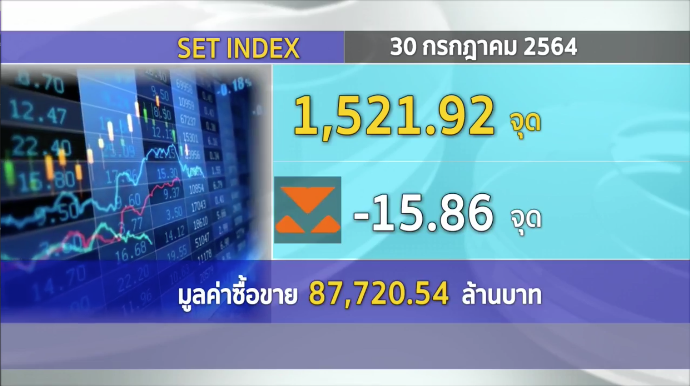 กทม. 30 ก.ค.-ตลาดหลักทรัพย์ ปิดวันนี้ที่ระดับ 1,521.92 จุด ลดลง 15.86 จุด (-1.03%) มูลค่าการซื้อขาย 87,720.54 ล้านบาท กังวลจะออกมาตรการเข้มสกัดโควิดระบาด/สัปดาห์หน้าแกว่งตัว