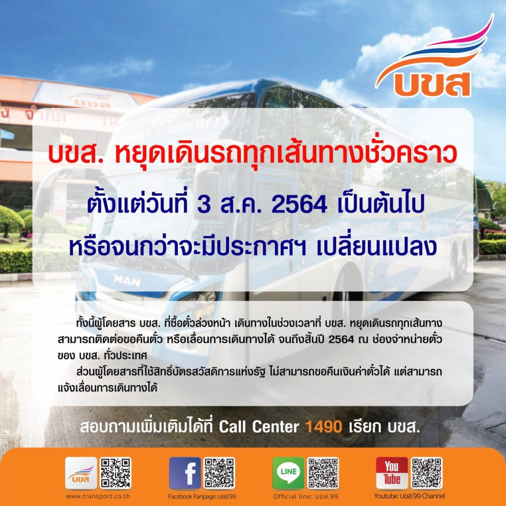 บขส. จึงขอแจ้งหยุดให้บริการเดินรถเส้นทางภาคเหนือ ภาคตะวันออกเฉียงเหนือและภาคตะวันออก และภาคใต้ ทุกเส้นทางชั่วคราว ตั้งแต่วันที่ 3 สิงหาคม 2564 เป็นต้นไป หรือจนกว่าจะมีประกาศคำสั่งเปลี่ยนแปลง