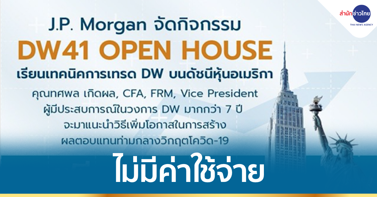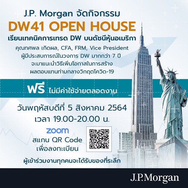 J.P. Morgan จัดกิจกรรม  DW41 Open House เรียนเทคนิคเทรด DW บนดัชนีหุ้นอเมริกา กับคุณทศพล เกิดผล ผู้มีประสบการณ์ในวงการ DW มากกว่า 7 ปี จะมาเเนะนำวิธีเพิ่มโอกาสในการสร้างผลตอบเเทนท่ามกลางวิกฤติโควิด-19 แบบฟรีๆ ไม่มีค่าใช้จ่าย