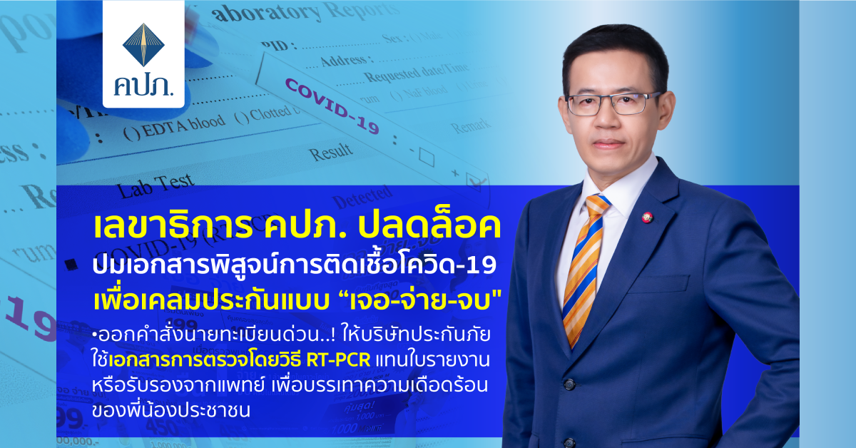 กรุงเทพฯ 7 ส.ค.-คปภ. ออกคำสั่งนายทะเบียนด่วน! ให้บริษัทประกันภัยใช้เอกสารการตรวจโดยวิธี RT-PCR แทนใบรายงานหรือรับรองจากแพทย์ สำหรับการจ่ายผลประโยชน์ตามกรมธรรม์ประกันภัย COVID-19 (แบบเจอ-จ่าย-จบ) เพื่อบรรเทาความเดือดร้อนของประชาชน