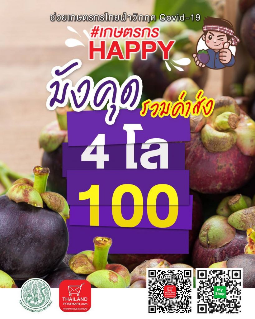 สำหรับแคมเปญ “เกษตรกรแฮปปี้” ภายใต้แนวคิด “คนกินยิ้มได้ เกษตรกรไทยแฮปปี้” ที่เปิดจำหน่ายผลผลิตมังคุดแบบส่งให้ถึงบ้าน (Delivery) ซึ่งเปิดให้ผู้สนใจทั่วประเทศสามารถสั่งซื้อมังคุดคละเกรด คุณภาพดี สดอร่อยจากภาคใต้ ได้ในราคา 4 กิโลกรัม 100 บาท รวมค่าส่งด้วยนั้น ได้รับความร่วมมือเป็นอย่างดีจากหลายหน่วยงาน เช่น บริษัท เซ็นทรัลพัฒนา จำกัด (มหาชน) บริษัท เซ็นทรัล ฟู้ด รีเทล จำกัด บริษัท ไปรยณีย์ไทย สมาคมขนส่งโลจิสติกส์ บริษัทแกร็บ และร้านธงฟ้า โดยใช้ศูนย์การค้าเซ็นทรัล พระราม 9 และเซ็นทรัล เวสต์เกต เป็นจุด Drop off เพื่อกระจายสินค้าจากภาคใต้ ภายใต้มาตรการควบคุมโรคของ ศบค. ล่าสุดราคามังคุดภาคใต้ซึ่งก่อนหน้านี้มังคุดคละเกรดอยู่ที่กิโลกรัมละ 3-7 บาท ปรับเพิ่มเป็น 13-15 บาทแล้ว ซึ่งจะต้องส่งเสริมการบริโภคภายในประเทศอย่างต่อเนื่อง