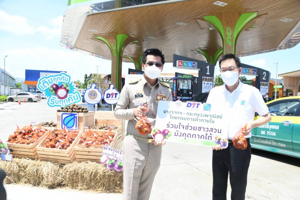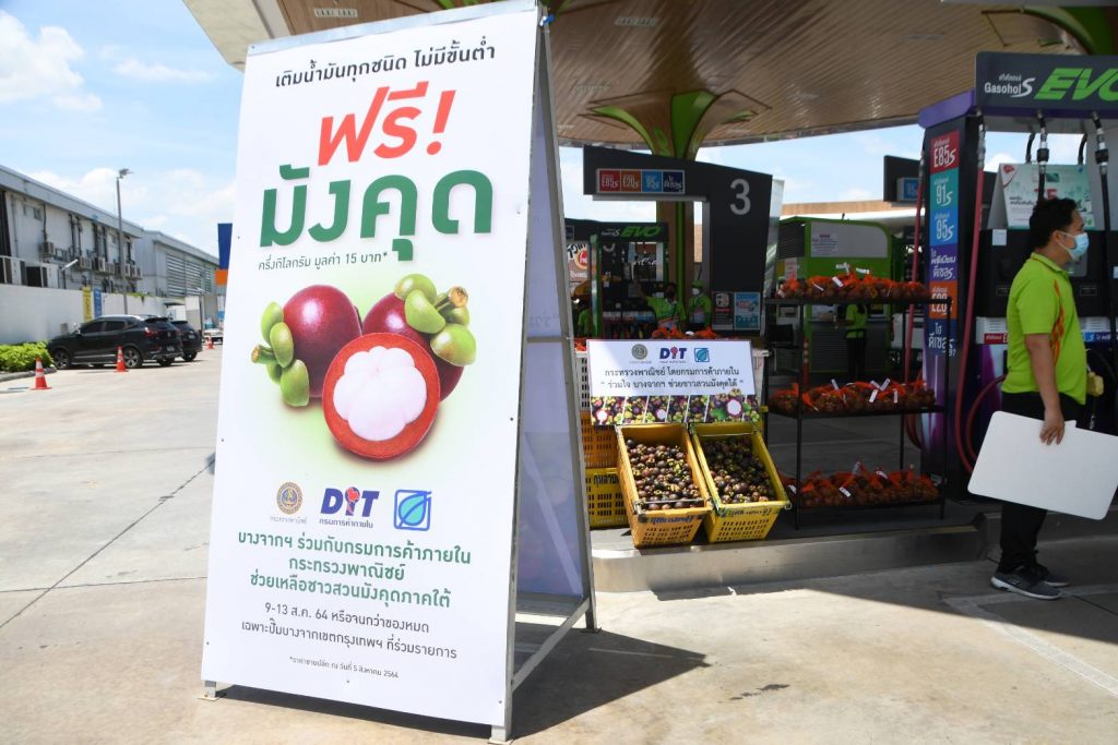 นอกจากนี้ ได้ผนึกกำลังปั๊มน้ำมัน ห้างค้าส่ง-ค้าปลีก ห้างท้องถิ่น ประกอบด้วย บริษัท พีทีจี เอนเนอยี จำกัด (มหาชน) บริษัท บางจาก คอร์ปอเรชั่น จำกัด และบริษัท ปตท. น้ำมันและการค้าปลีก จำกัด (มหาชน) เครือข่ายทายาทร้านค้าส่ง-ค้าปลีก (YTS) กว่า 100 สาขาทั่วประเทศ ห้างค้าปลีก-ค้าส่ง ได้แก่ สยามแมคโคร โลตัส เซ็นทรัล เดอะมอลล์ บิ๊กซี ซีพีออล์ เร่งเข้ารับซื้อมังคุดจากเกษตรกรโดยตรงในแหล่งผลิตมังคุดที่สำคัญ มีปริมาณการสั่งซื้อล่วงหน้าแล้วมากกว่า 1 ล้านกิโลกรัม ซึ่งขณะนี้สถานีบริการน้ำมันพีทีที สเตชั่น และสถานีการน้ำมันบางจาก ยังได้มีการแจกมังคุดใช้ผู้บริการเติมน้ำมันฟรี ในเขตกรุงเทพฯ เพื่อช่วยสนับสนุนเกษตรกรและเชิญชวนประชาชนบริโภคมังคุดอีกด้วย