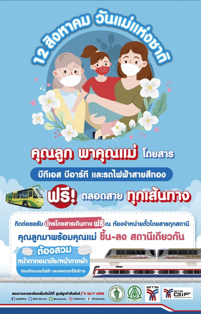 กรุงเทพฯ 9 ส.ค.- วันแม่แห่งชาติ 12 ส.ค.นี้ คุณลูกพาคุณแม่ขึ้นรถไฟฟ้าบีทีเอส บีอาร์ที และรถไฟฟ้าสายสีทอง ฟรีตลอดสาย ทุกเส้นทาง พร้อมคุมเข้มป้องกันโควิด-19