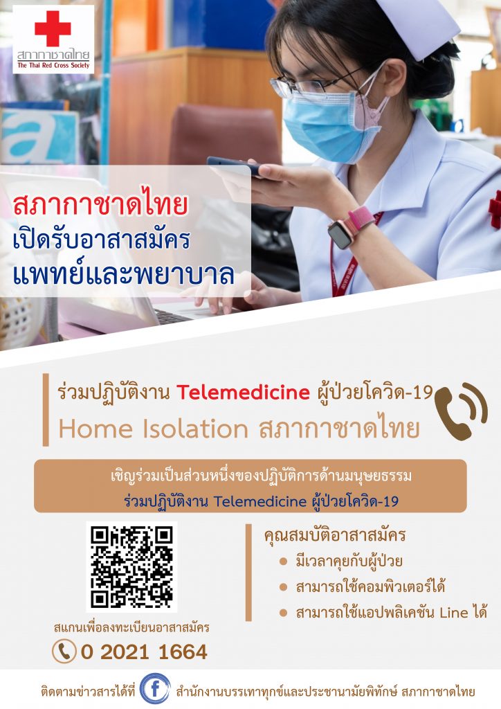 กรุงเทพฯ 11 ส.ค. – สภากาชาดไทยเปิดระบบ Telemedicine ช่วยเหลือผู้ป่วยโควิด-19 กลุ่มสีเขียวที่รักษาตัวที่บ้าน ระดมแพทย์พยาบาลจิตอาสาร่วมทีมเพิ่มด่วน พร้อมประสานผู้ประกอบการขนส่งเพื่อจัดส่งยา อุปกรณ์การแพทย์ และอาหารให้ผู้ป่วยทั้ง 3 มื้อ
