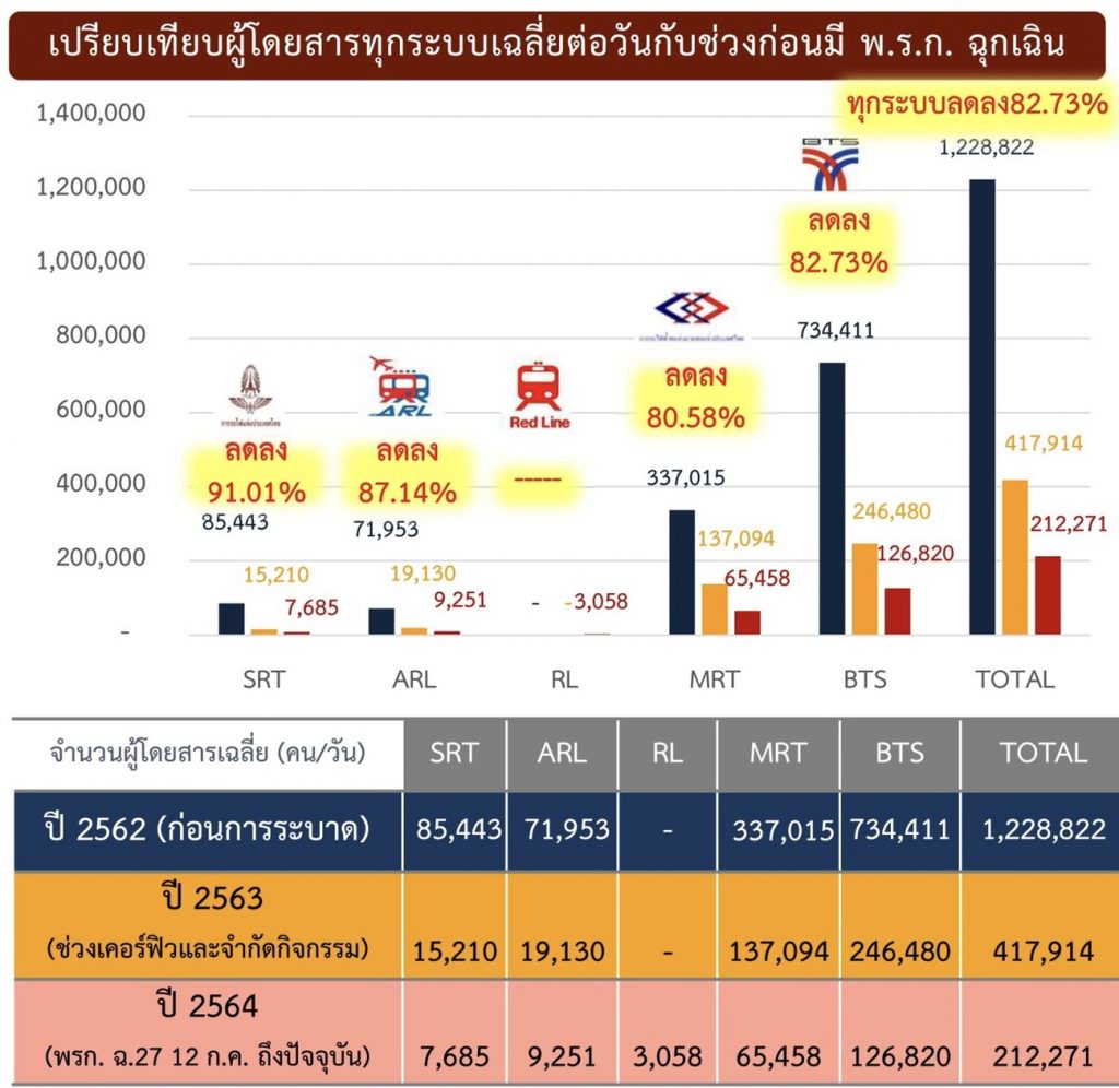 ผู้สื่อข่าวรายงานว่า ผลกระทบจากการระบาดของโควิด-19 ระลอกใหม่ในประเทศไทย ซึ่งสถานการณ์ปัจจุบันยังมีผู้ติดเชื้อมากกว่าวันละ 20,000 คน ขณะที่ภาครัฐออกมาตรการชะลอการเดินทางของประชาชน รวมถึงมาตรการรณรงค์ให้มีการ “Work from Home” ให้มากที่สุดนั้น หากมีการติดตามตัวเลขการเดินทาง ผ่านระบบขนส่งทางราง นับตั้งแต่มี พ.ร.ก.ฉุกเฉินฯ ฉบับที่ 27 พบว่าสถิติการเดินทางขณะนี้ โดยรวมระบบรถไฟฟ้าทั้งหมด ทั้ง BTS รถไฟฟ้า MRT สายสีน้ำเงินและม่วง รถไฟฟ้า Airport Rail Link จนถึงระบบรถไฟทางไกล ของการรถไฟแห่งประเทศไทย หรือ รฟท. พบว่า ปัจจุบัน ระบบราง มีผู้โดยสาร เหลือเฉลี่ยวันละ 212,271 คน ลดลง 82.73% เมื่อเทียบกับปี 2562 ก่อนสถานการณ์โควิดระบาด ที่ระบบรางทั้งหมด มีผู้โดยสาร 1,228,822 คน/วัน และลดลงจากยอดผู้โดยสาร ในปี2563 ที่มีการประกาศเคอร์ฟิว และจำกัดกิจกรรม ในรอบแรก ที่มีผู้โดยสาร 417,914 คน/วัน