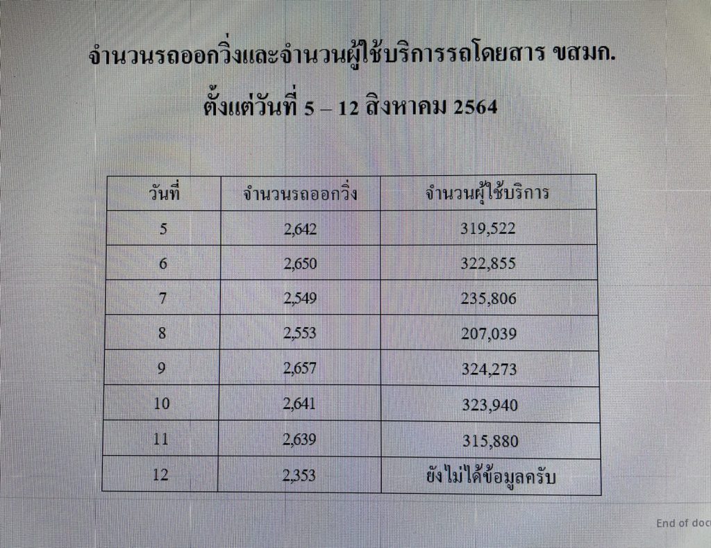 ทั้งนี้ หากพิจารณาให้ครบถ้วนทุกระบบขนส่งวันนี้ กลับไปติดตามตัวเลข ผู้โดยสารระบบเดินทางของคน กทม.และปริมณฑล โดยเฉพาะรถเมล์โดยสาร ขององค์การขนส่งมวลชนกรุงเทพ หรือ ขสมก. ที่ก่อนสถานการณ์โควิด มีผู้ใช้บริการเฉลี่ย วันละ 1 ล้านคน แต่สถานการณ์ล่าสุด พบว่า ในช่วงเดือนสิงหาคมนี้ ขสมก.มีผู้ใช้บริการ เฉลี่ยมากกว่าวันละ 300,000 คน/วัน เล็กน้อยในวันธรรมดา และลดลงเหลือ มากกว่า 200,000 คน/วัน เล็กน้อย ในวันหยุด