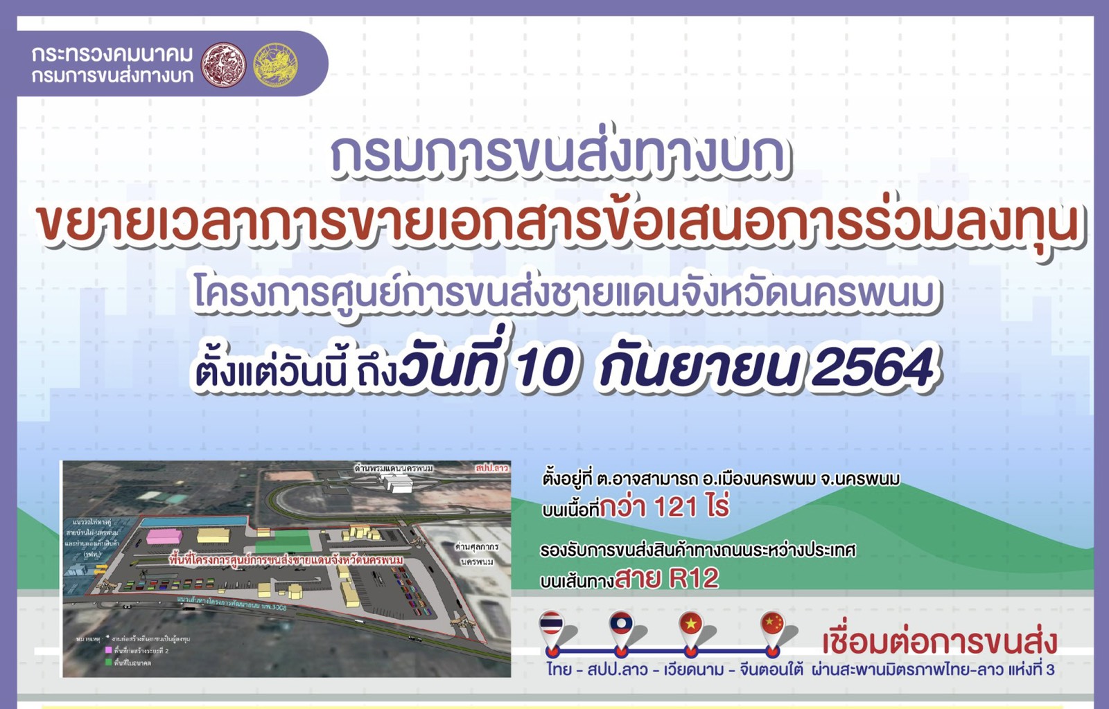 กรุงเทพฯ 13 ส.ค.-กรมการขนส่งทางบก ขยายระยะเวลาการขายเอกสารข้อเสนอการร่วมลงทุนโครงการศูนย์การขนส่งชายแดนจังหวัดนครพนม ตั้งแต่บัดนี้เป็นต้นไป จนถึงวันที่ 10 กันยายน 2564
