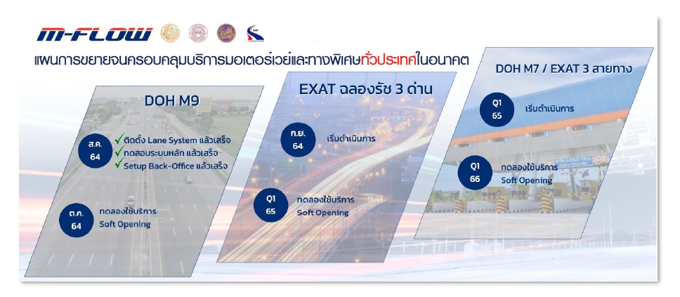นายศักดิ์สยาม ชิดชอบ รัฐมนตรีว่าการกระทรวงคมนาคม กล่าวว่า การลงพื้นที่ตรวจความพร้อมของการพัฒนาระบบจัดเก็บค่าธรรมเนียมผ่านทางอัตโนมัติแบบไม่มีไม้กั้น หรือ M-Flow เป็นการตรวจความพร้อมทั้งในส่วนอุปกรณ์และการเชื่อมต่อกับระบบควบคุมรายการผ่านทางในระดับช่องทาง รวมไปถึงการส่งข้อมูลรถที่ผ่านทางเข้าไปยังระบบ Single Platform ที่อาคารศูนย์ควบคุมฯ ด้วย ซึ่งพบว่าโดยรวมของระบบมีความพร้อมสำหรับการเปิดให้ประชาชนทดลองใช้บริการแล้ว โดยกรมทางหลวงมีกำหนดที่จะทดสอบระบบเสมือนจริงแบบครบวงจร (Soft Opening) ในช่วงเดือนตุลาคม 2564 โดยคาดว่าระบบ M-Flow จะพร้อมเปิดบริการเต็มรูปแบบในปี 2565 โดยเปิดให้บริการทางหลวงพิเศษระหว่างเมืองหมายเลข 9 ครบทั้ง 4 ด่าน ได้แก่ ด่านทับช้าง 1 ด่านทับช้าง 2 ด่านธัญบุรี 1 และด่านธัญบุรี 2 ในช่วงเดือนมกราคม 2565 ทางพิเศษฉลองรัช ระยะแรก จำนวน 3 ด่าน ได้แก่ ด่านจตุโชติ ด่านสุขาภิบาล 5-1 และด่านสุขาภิบาล 5-2 คาดว่าจะเปิดให้บริการได้ในช่วงไตรมาสแรกของปี 2565 ส่วนทางหลวงพิเศษระหว่างเมืองหมายเลข 7 กรุงเทพฯ-บ้านฉาง และทางพิเศษฉลองรัช ระยะที่ 2 บูรพาวิถี และกาญจนาภิเษก คาดว่าจะสามารถเปิดทดสอบระบบได้ในช่วงปี 2566