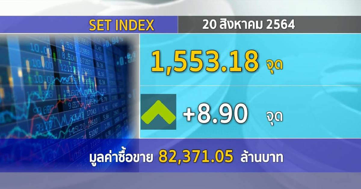 กทม. 20 ส.ค.-ตลาดหลักทรัพย์ ปิดวันนี้ที่ระดับ 1,553.18 จุด เพิ่มขึ้น 8.90 จุด (+0.58%) มูลค่าการซื้อขาย 82,371.05 ล้านบาท รีบาวด์ได้ดีกว่าตลาดหุ้นต่างประเทศ หลังยอดผู้ติดเชื้อโควิดลดต่ำกว่าระดับ 2 หมื่นคน/วันและฉีดวัคซีนเร่งตัวขึ้น