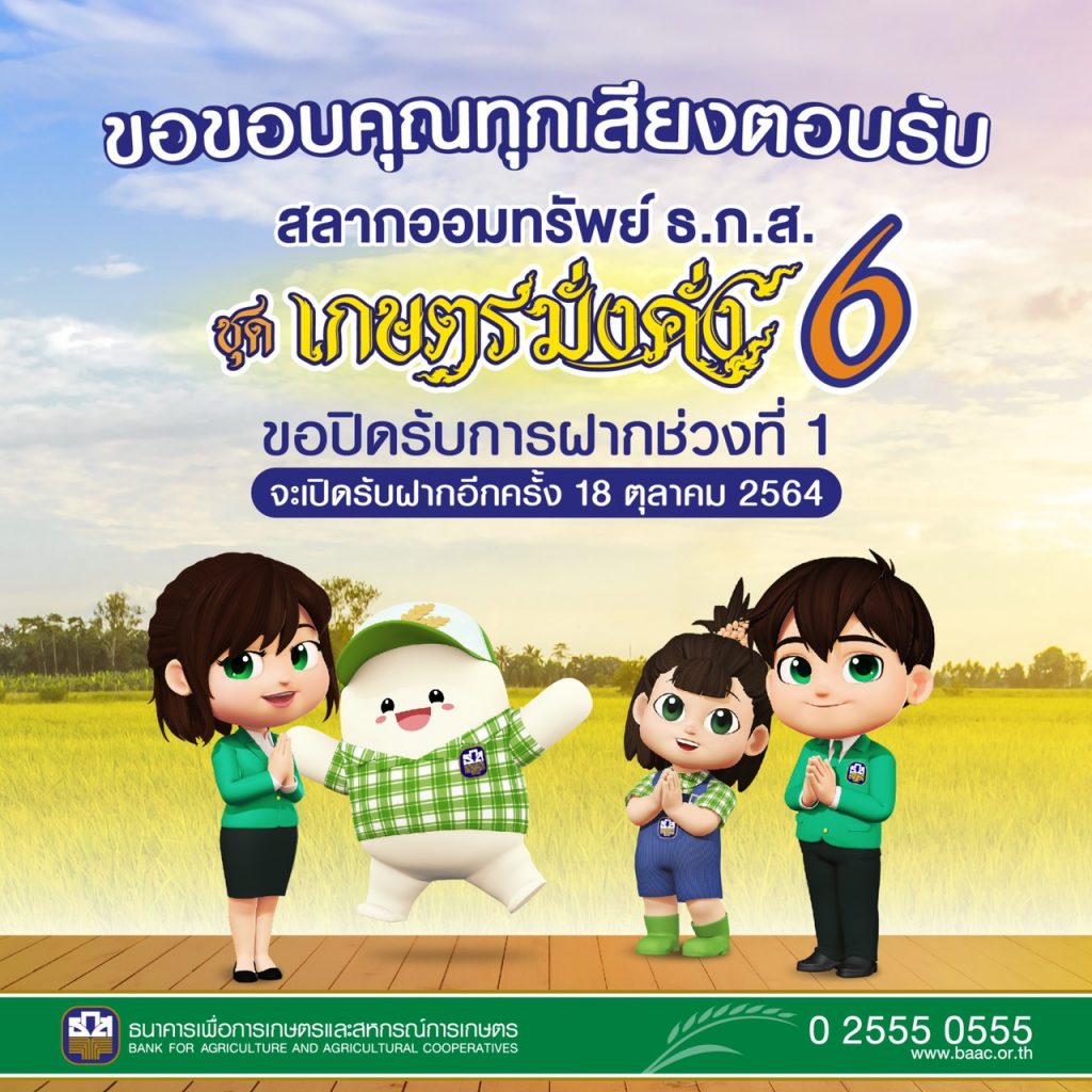 ธ.ก.ส.ปลื้ม! สลากออมทรัพย์ ธ.ก.ส. ชุดเกษตรมั่งคั่ง 6 หน่วยละ 100 บาท วงเงิน 50,000 ล้านบาท ลุ้นรางวัล 10 ล้านบาท เปิดรับฝากวันแรก 20 สิงหาคม 2564 รับฝากหมดภายในครึ่งวัน พร้อมขอบคุณลูกค้าผู้มีอุปการคุณทุกท่านที่ให้การตอบรับเป็นอย่างดี สำหรับผู้ที่สนใจฝากสลากออมทรัพย์ ธ.ก.ส. ชุดเกษตรมั่งคั่ง 6 ธ.ก.ส.จะเปิดรับฝากสลากฯ อีกครั้ง ในวันที่ 18 ตุลาคมนี้ วงเงิน 50,000 ล้านบาท ผ่านช่องทาง ธ.ก.ส. A-Mobile และ ธ.ก.ส. ทุกสาขาทั่วประเทศ