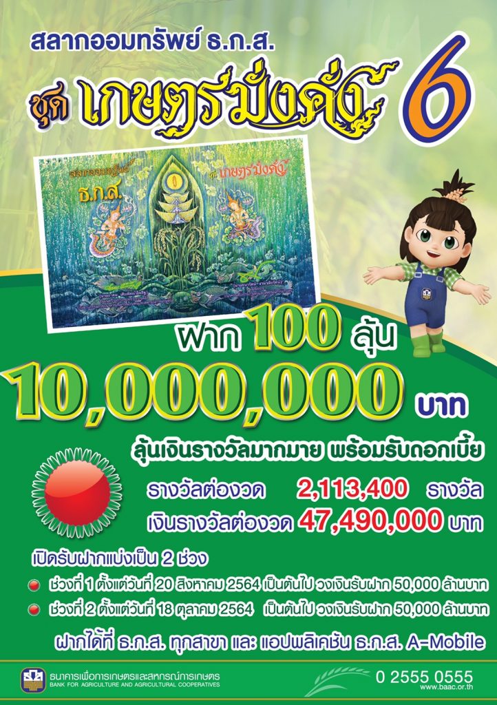 นายธนารัตน์ งามวลัยรัตน์ ผู้จัดการธนาคารเพื่อการเกษตรและสหกรณ์การเกษตร (ธ.ก.ส.) เปิดเผยว่า จากการที่ ธ.ก.ส.ได้เปิดรับฝาก “สลากออมทรัพย์ ธ.ก.ส. ชุดเกษตรมั่งคั่ง 6” จำนวน 1,000 ล้านหน่วย หน่วยละ 100 บาท รวมวงเงิน 100,000 ล้านบาท มีอายุการรับฝาก 3 ปี ลุ้นรางวัลสูงสุด 10 ล้านบาท รวมมูลค่าสูงสุดกว่า 47 ล้านบาท/เดือน ซึ่งแบ่งการเปิดรับฝากเป็น 2 ช่วง ได้แก่ ช่วงที่ 1 ตั้งแต่วันที่ 20 สิงหาคม 2564 เป็นต้นไป วงเงินรับฝาก 50,000 ล้านบาท และช่วงที่ 2 วันที่ 18 ตุลาคม 2564 เป็นต้นไป วงเงินรับฝาก 50,000 ล้านบาท สำหรับการรับฝากสลากฯ ในช่วงที่ 1 นั้น ได้รับเสียงตอบรับเป็นอย่างดีจากเกษตรกรลูกค้าและประชาชนทั่วไป ทำให้ยอดรับฝากเต็มวงเงินอย่างรวดเร็วภายในระยะเวลาเพียงครึ่งวันเท่านั้น โดยมียอดรับฝากผ่านทางแอปพลิเคชัน ธ.ก.ส. A-Mobile จำนวนกว่า 10,000 ล้านบาท และยอดรับฝากผ่านทางเคาน์เตอร์ธนาคาร จำนวนกว่า 40,000 ล้านบาท