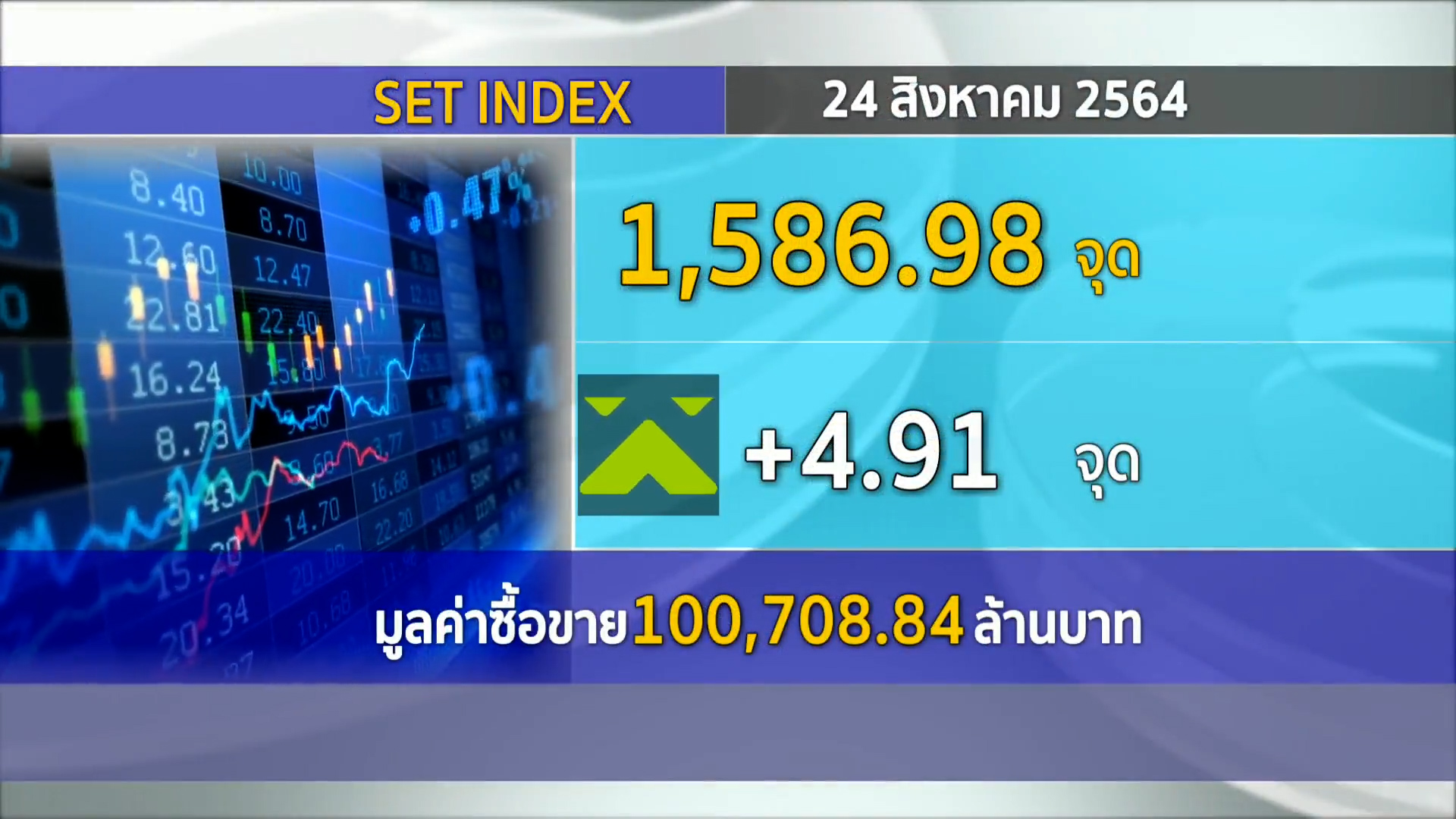 กทม. 24 ส.ค.- ตลาดหลักทรัพย์ ปิดวันนี้ที่ระดับ 1,586.98 จุด เพิ่มขึ้น 4.91 จุด (+0.31%) มูลค่าการซื้อขาย 100,708.84 ล้านบาท ดีดตัวแรงรับดอลลาร์อ่อน-น้ำมันขึ้นก่อนเจอแรงขายทำกำไรกดดัน