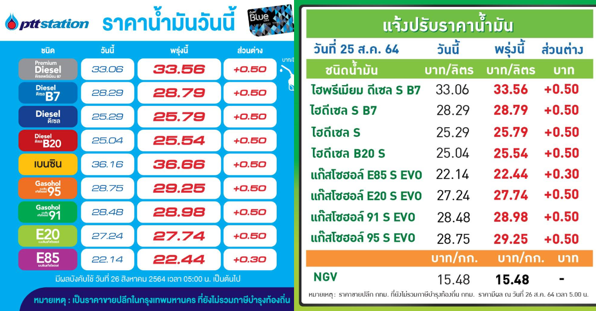 กรุงเทพฯ 25 ส.ค.-PTT Station-บางจากฯ ปรับราคาขายปลีกน้ำมันทุกชนิดขึ้น 50 สตางค์/ลิตร เว้น E85 ปรับขึ้น 30 สตางค์/ลิตร มีผล 26 ส.ค.64 เวลา 05.00 น. เป็นต้นไป